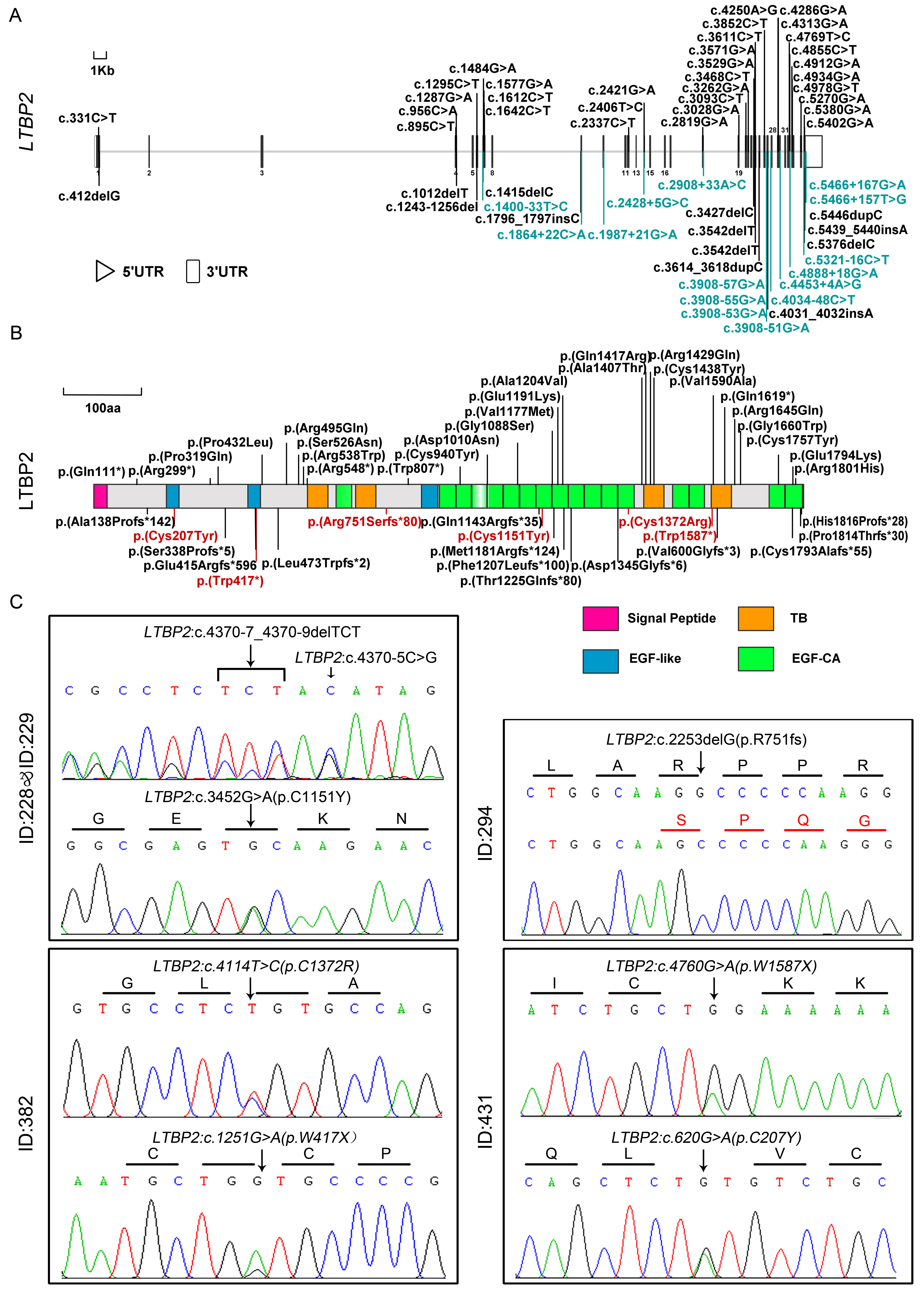 variants in blue), and the novel variants identified in this study are in red. B: The position of LTBP2 mutations identified