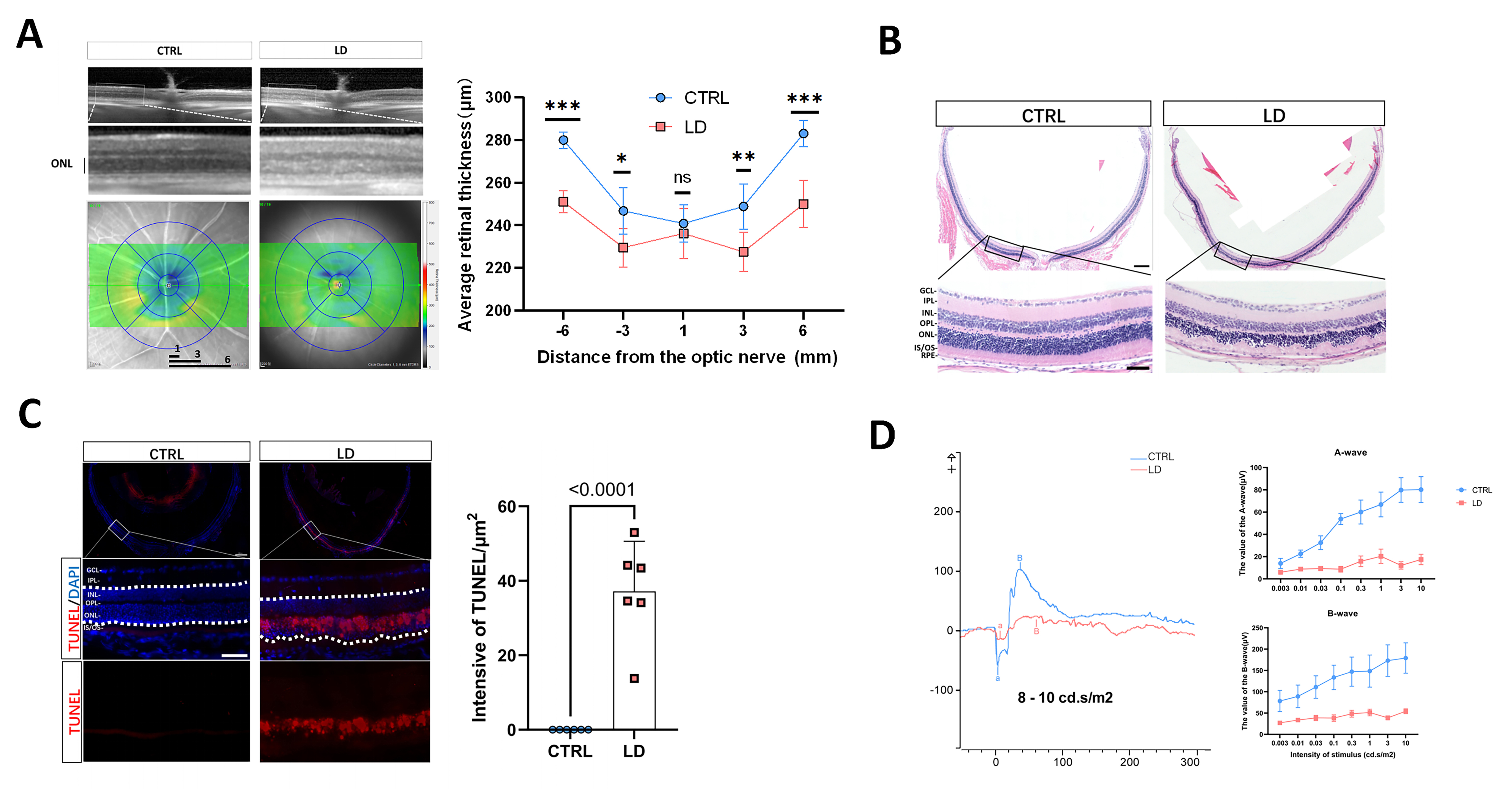 outer nuclear layer (ONL); n = 5 mice per group. B: HE staining shows retina structure in CTRL and LD mice. Scale bar: upper panel: 200 μm, lower panel: 50 μm. GCL: ganglion