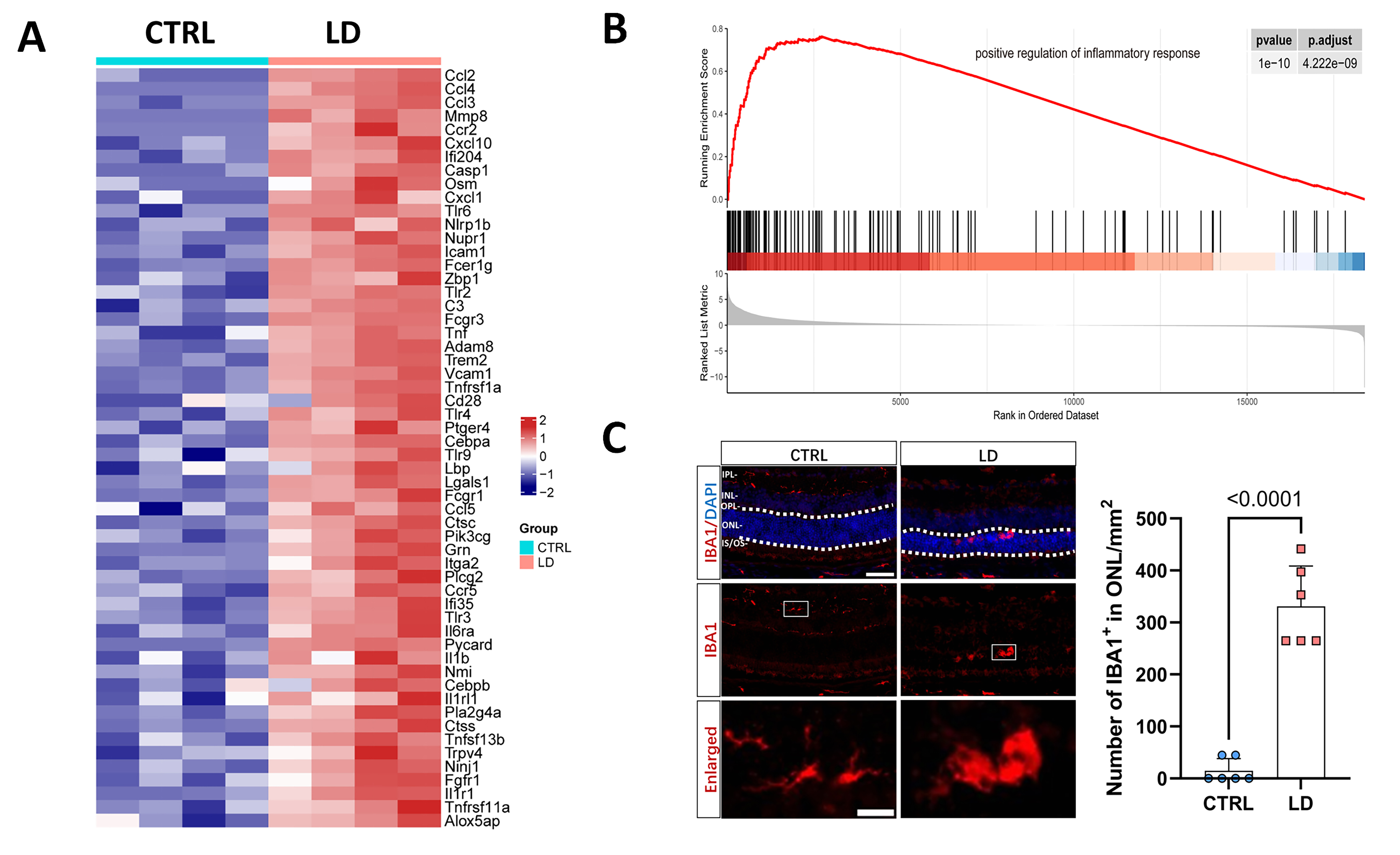A: A heatmap shows genes for positive regulation of inflammatory response in control (CTRL) and LD mouse retinas. n = 4 mice