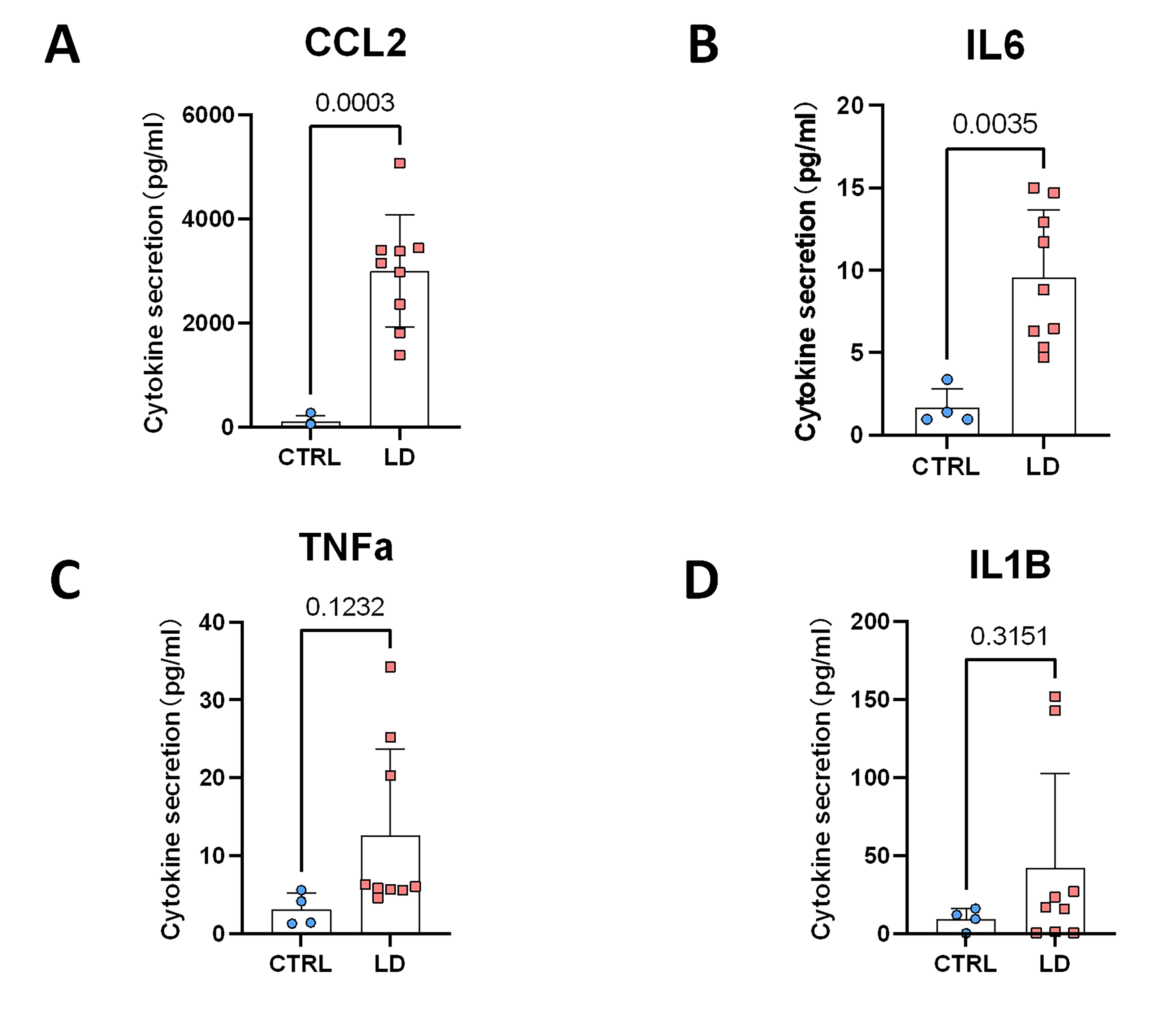 Quantification of inflammatory factors in VH by the Ella system. The VH samples from the CTRL and LD mouse eyes were collected. For the CTRL group, n = 4 mice; for the LD group, n = 9 mice. The