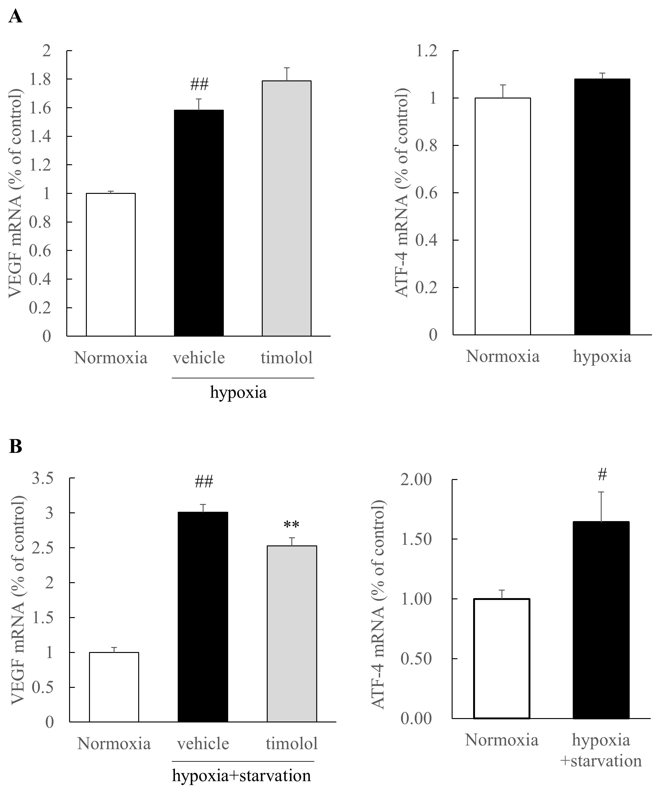 Figure 3. Effects of timolol on gene expressions in HRMECs under hypoxia. Expressions of Vegf and Atf4 in HRMECs cultured under hypoxic conditions (A) and under hypoxia and serum starvation (B) and treated with timolol for 6 h. Results are the mean ± SEM (n = 4–8). *p<0.05, **p<0.01 versus vehicle, ##p<0.01, #p<0.05 versus normoxia (Tukey’s test or student t test).