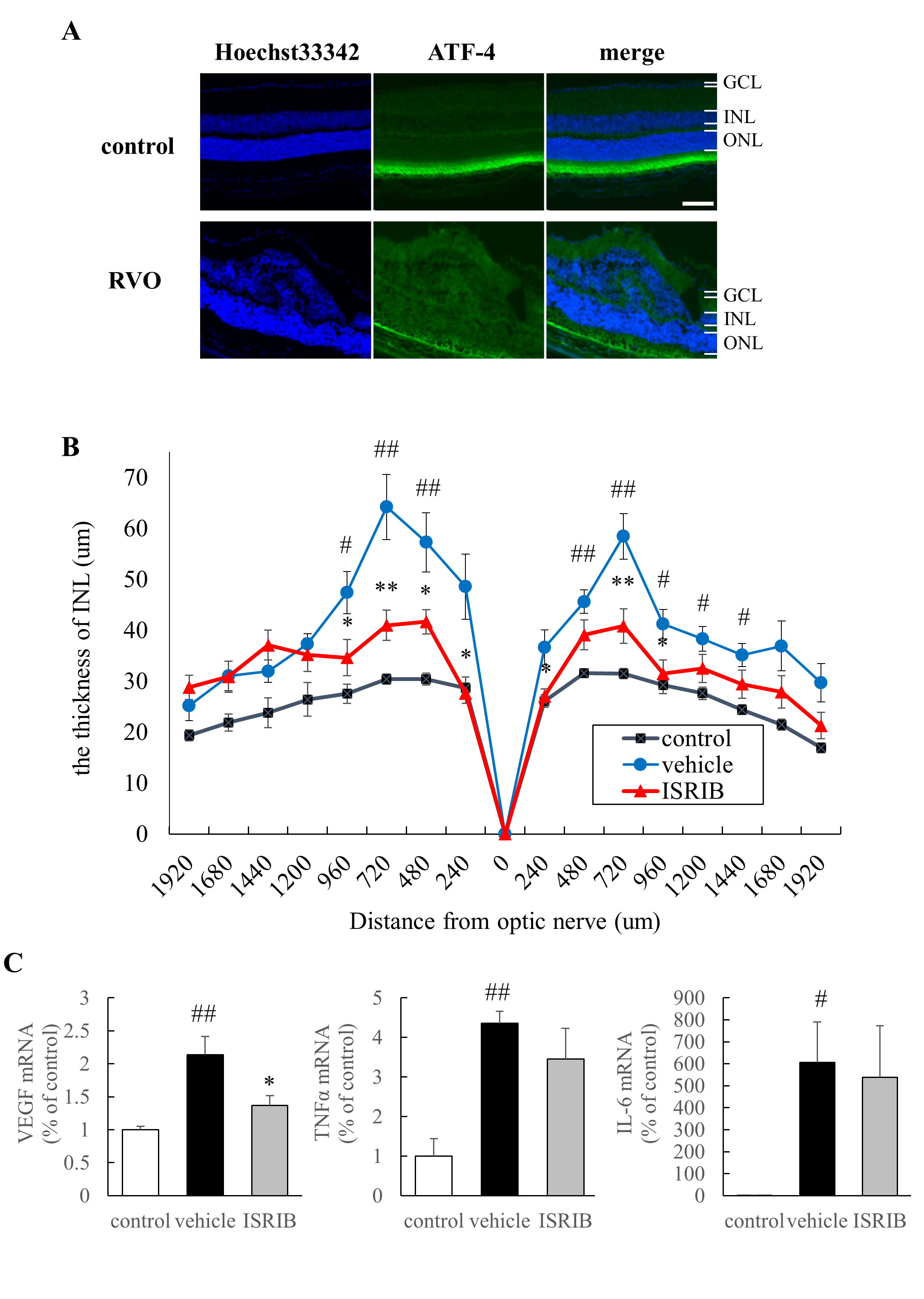 after IV injection of ISRIB. Results are the mean ± SEM (n = 5–12). *p<0.05, **p<0.01 versus vehicle, #p<0.05, ##p<0.01 versus control (Tukey’s test). (C) Expressions of Vegf, Tnf-α, and Il6 in occluded retinas 12 h after ISRIB injection. Results are the mean ± SEM (n = 5–12). *p<0.05, **p<0.01 versus vehicle, #p<0.05, #xss#p<0.01 versus control (Tukey’s test).