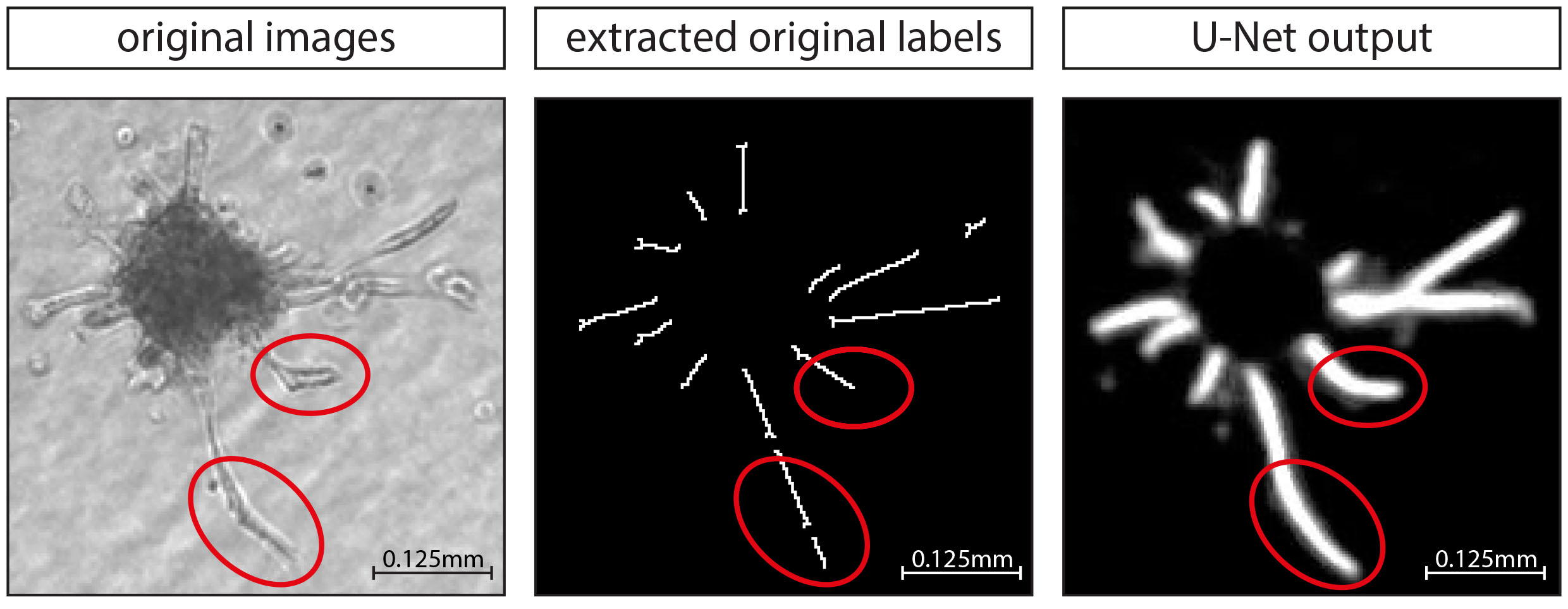 Figure 4. The U-Net model canonically segments bending sprouts, although it was trained on linear segmentation. The examples demonstrate