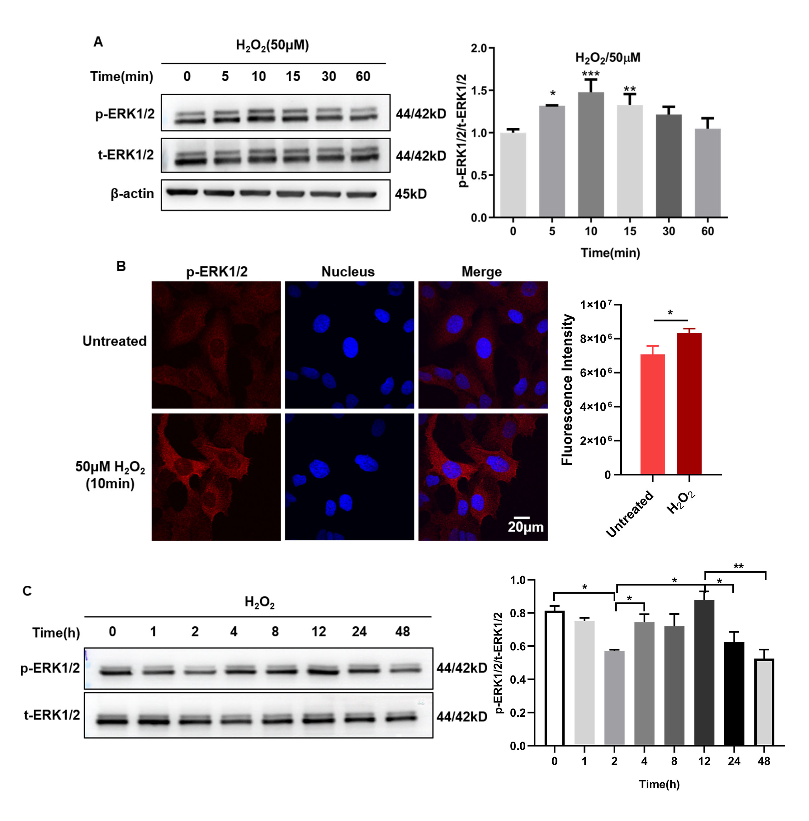 with one-way ANOVA followed by Dunnett’s multiple comparisons test (*p<0.05, **p<0.01, and ***p<0.001). B: Immunofluorescent staining of p-ERK1/2 after exposing LECs to 50 μM of H2O2 for 10 min. C: Western blotting of p-ERK1/2 and t-ERK1/2 after treatment of LECs with 50 μM of H2O2 for 1, 2, 4, 8, 12, 24, and 48 h. Statistical analysis of the p-ERK1/2 to t-ERK1/2 ratio was performed with the Student t test. The data are shown as mean ± standard error of the mean (SEM) with n = 3.
