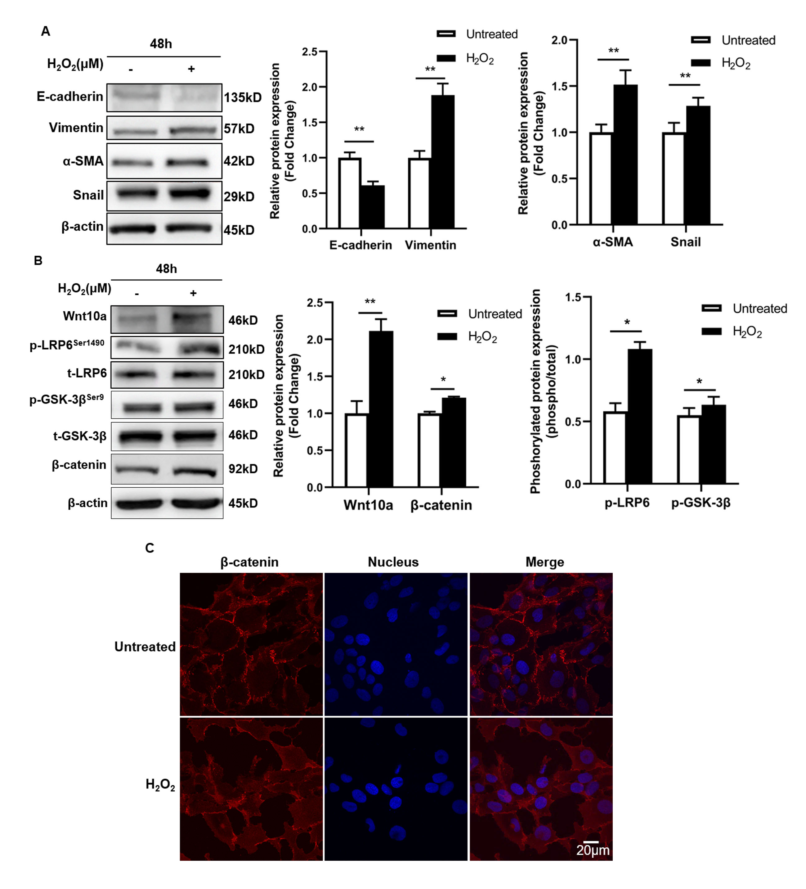 Figure 2. Exposing LECs to 50 μM of H2O2 for 48 h activated Wnt/β-catenin signaling and promoted EMT. A: Western blotting of E-cadherin, vimentin, α-SMA, and Snail. B: Western blotting of Wnt 10a, p-LRP6Ser1490, p-GSK-3βser9, and β-catenin. C: Immunofluorescent images of β-catenin. Statistical analysis was performed with the paired Student t test (*p<0.05 and **p<0.01). The data are shown as mean ± standard error of the mean (SEM) with n = 3.