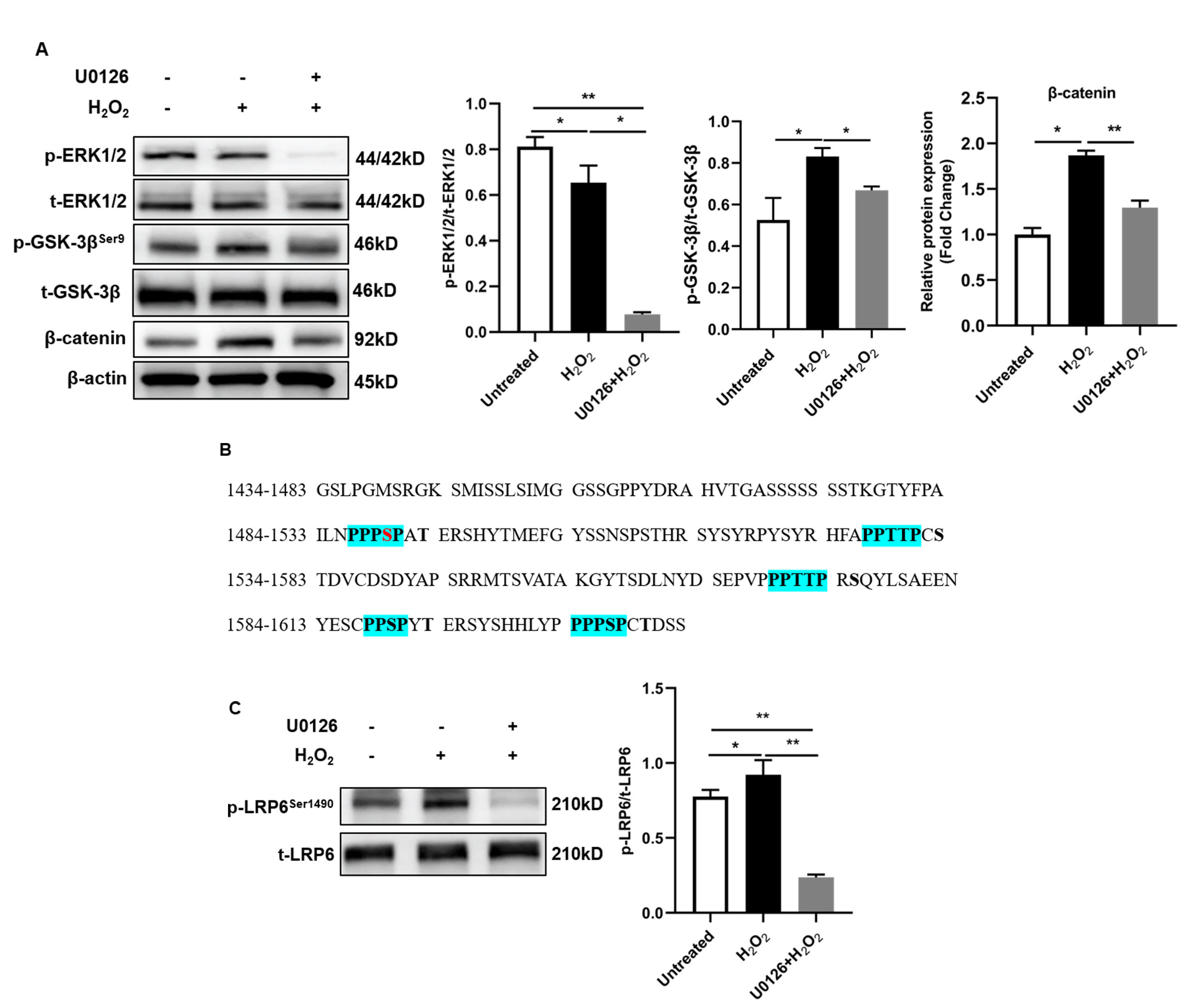 Figure 5. Blocking ERK1/2 signaling prevented Wnt/β-catenin signal transduction in LEC under moderate oxidative stress. A: Inactivation of ERK1/2 signaling inhibited p-GSK-3βSer9 and β-catenin. B: Intracellular domain (ICD) of LRP6, five PPPS/TP motifs within ICD are highlighted, and Ser 1490 is marked in red. C: Inactivation of ERK1/2 signaling inhibited LRP6 phosphorylation at Ser 1490 (*p<0.05 and **p<0.01). Statistical analysis