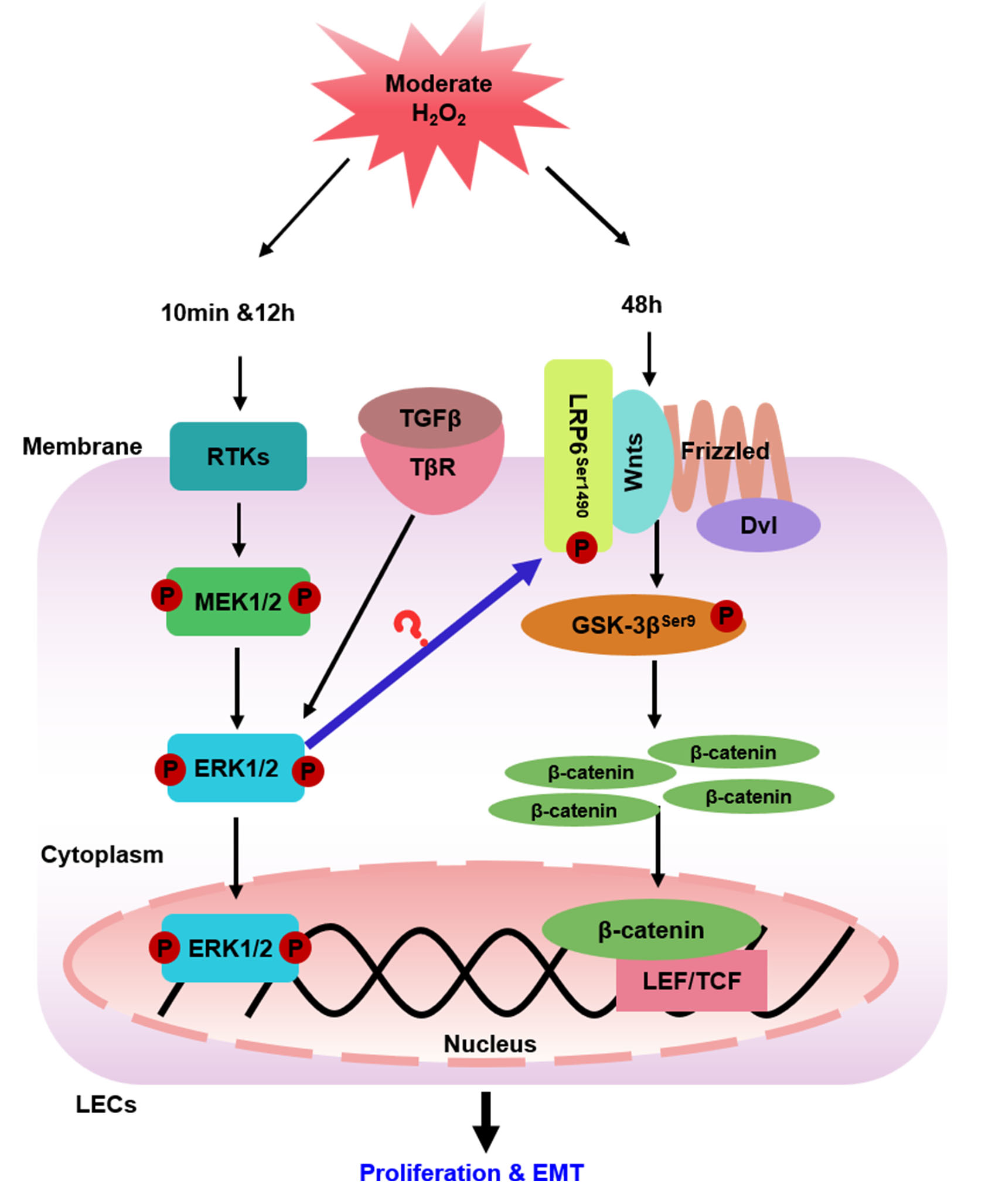 Schematic crosstalk between ERK1/2 and Wnt/β-catenin signaling under moderate levels of H