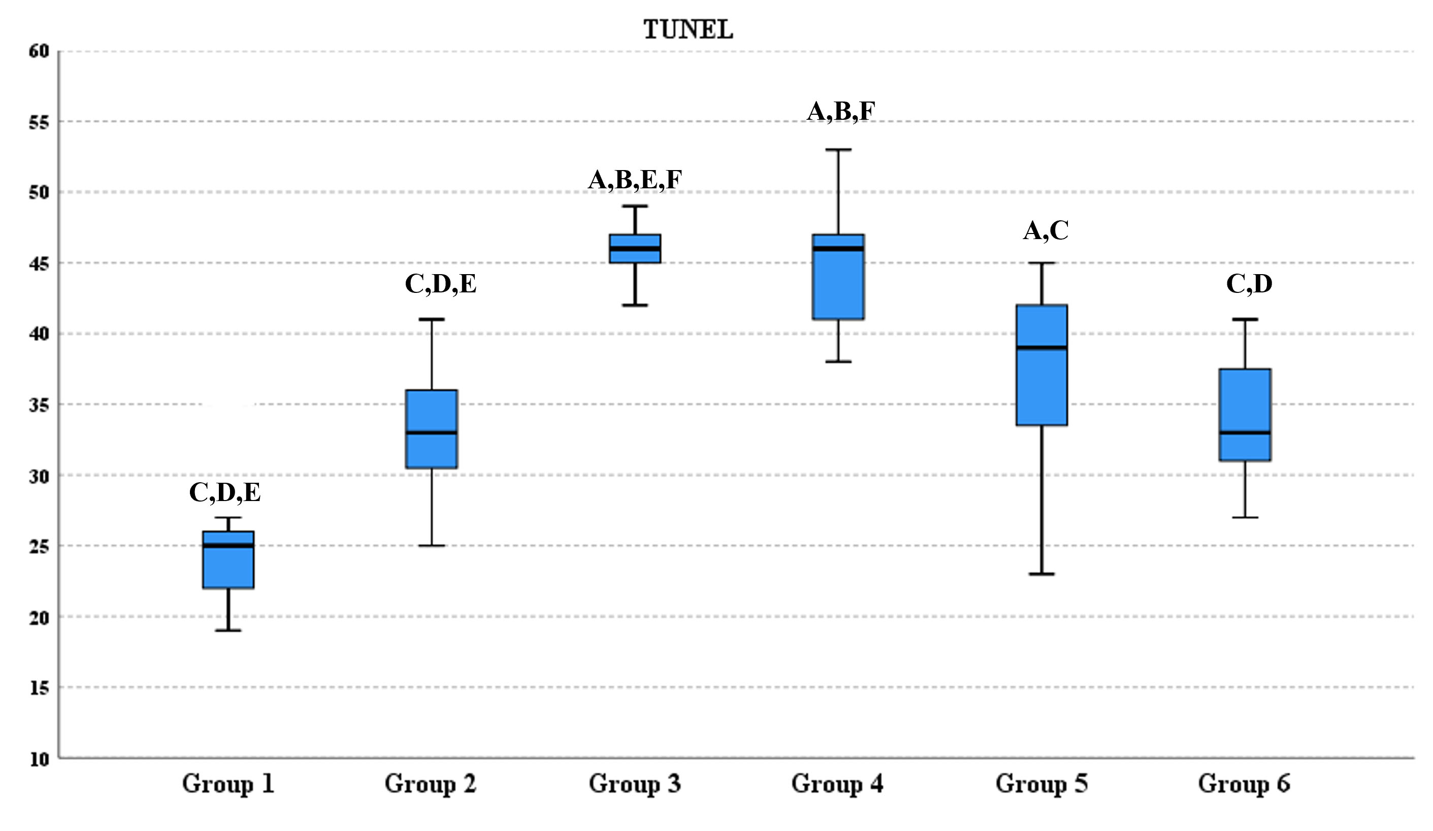 TUNEL results of all groups (number of TUNEL-positive cells/total cells). There is a statistically significant difference when compared with A) Group 1, B) Group 2, C) Group 3, D) Group 4, E) Group 5, and F) Group 6 (p<0.05).