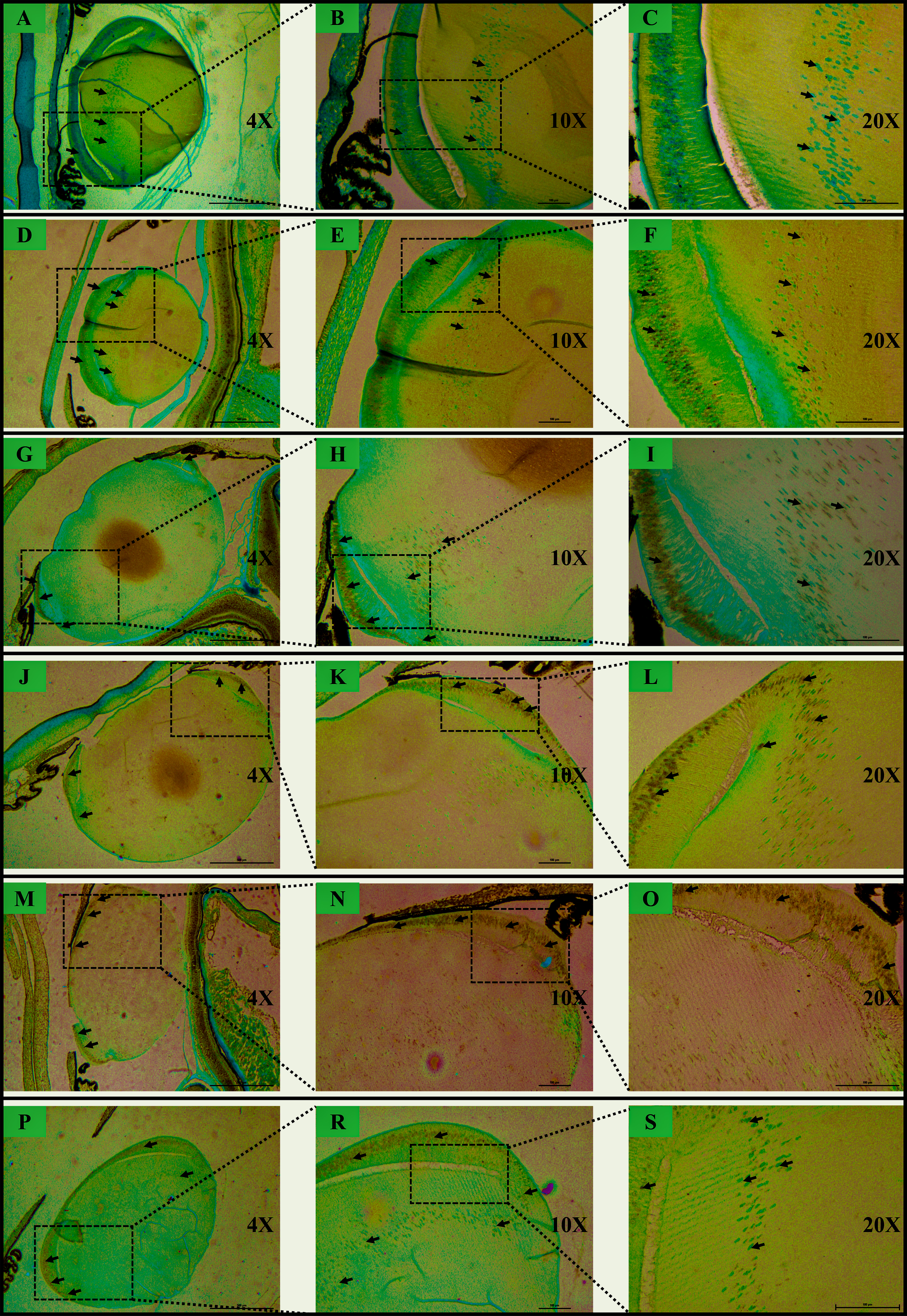 Figure 4. TUNEL staining of the lenses in all groups. Arrows indicate apoptosis-positive cells stained in the lenses. A, B, C; Group 1, D, E, F; Group 2, G, H, I) Group 3, J, K, L; Group 4, M, N, O; Group 5, P, R, S; Group 6 (X4, X10, X20 enlargement ratios, respectively).