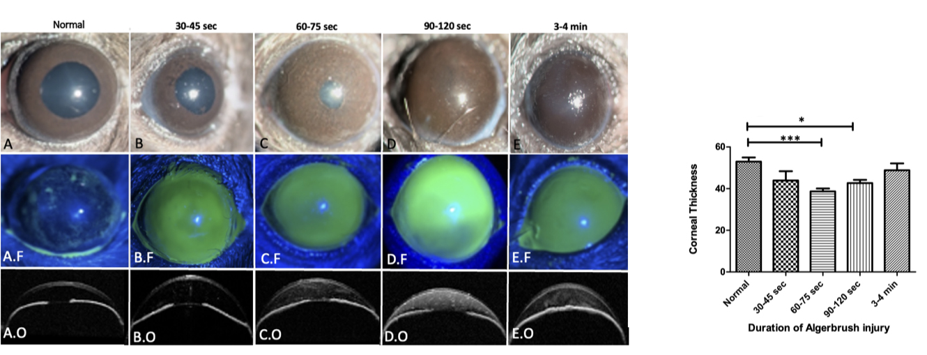 images. E: A 3–4 min injury also resulted in significant corneal edema and pigment release. B: The corneal thickness in normal eyes and immediately after injury. Statistical analysis revealed significant differences