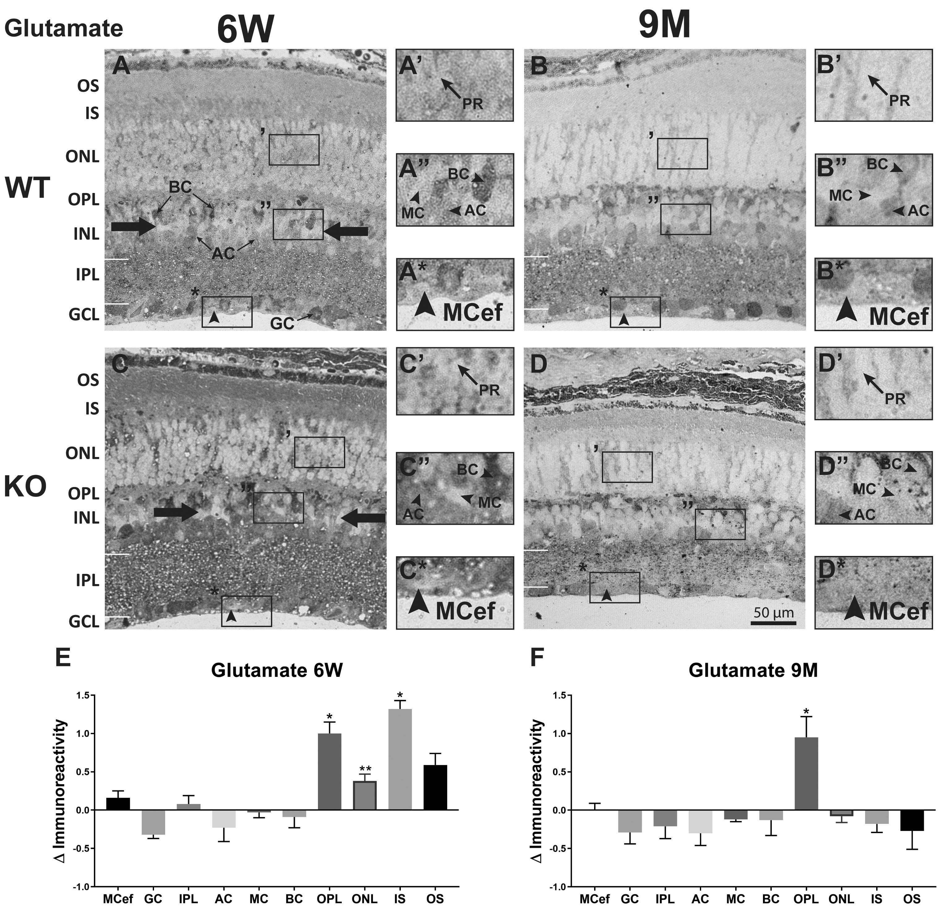 AC, and the Müller cell endfeet (MCef). (E and F) Quantitative analysis of glutamate in each retinal layer expressed as the