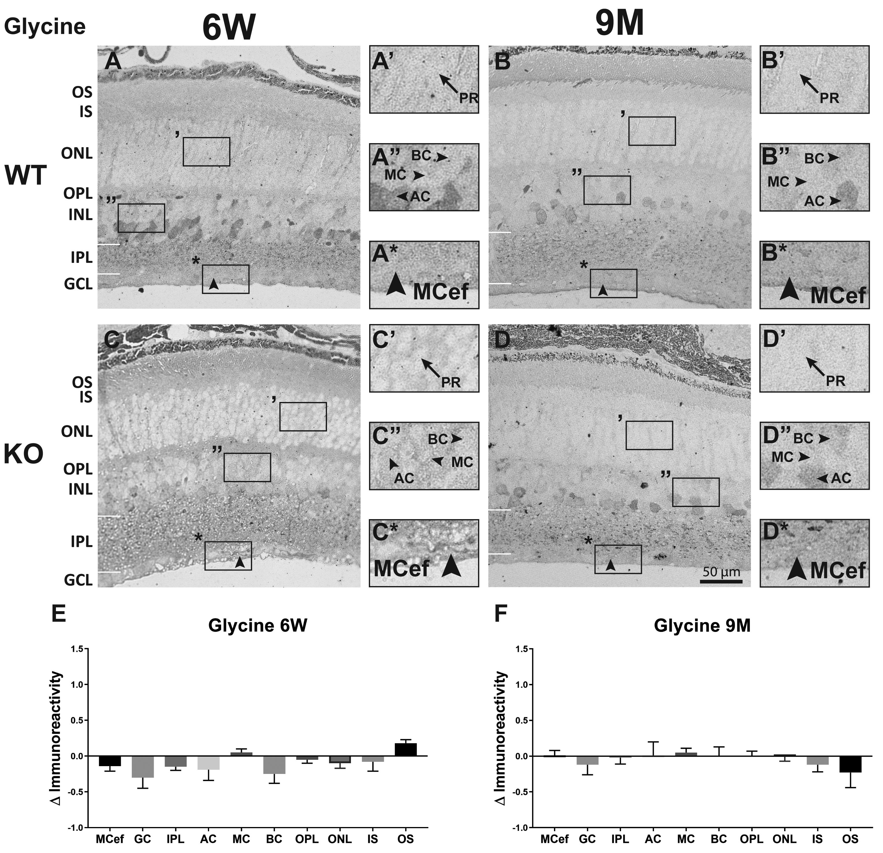 of glycine immunoreactivity in the 6-week WT (A) and xCT KO (C) retinas, and 9-month WT (B) and xCT KO (D) retinas. The individual