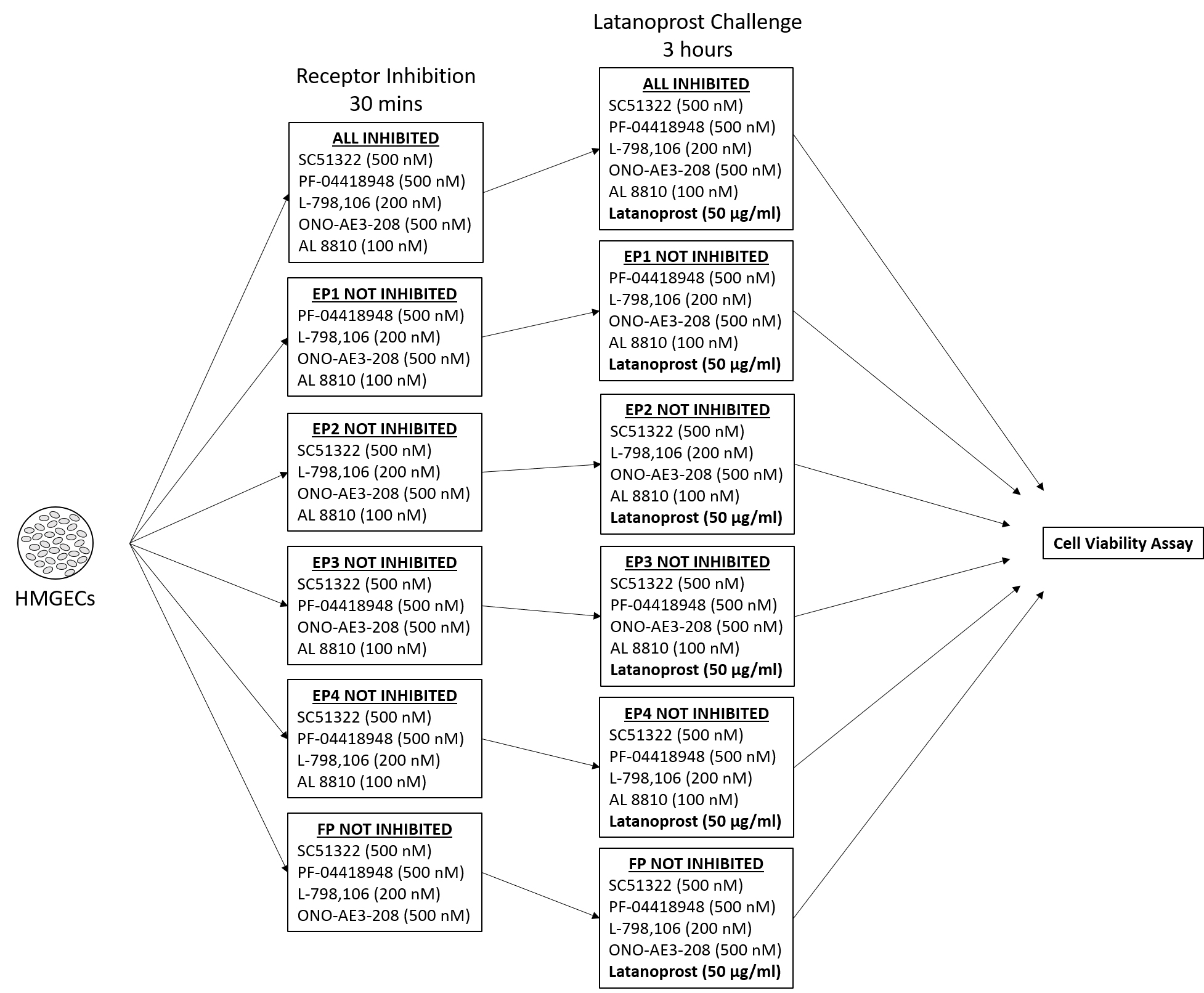 Figure 1. Study design for EP- and FP-type receptor inhibitor experiments. Each well was seeded with 30,000 HMGECs and allowed to differentiate