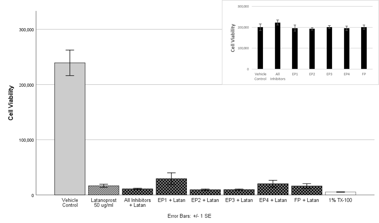 Receptor inhibition alone—in the absence of a latanoprost challenge—had no effect on cell viability, thereby confirming that