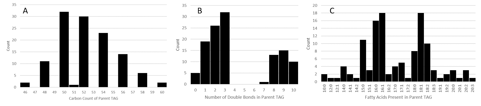 and double-bond counts ranging from 0 to 10 (B). There were 24 unique fatty acyl chains identified from parent TAGs. TAG: