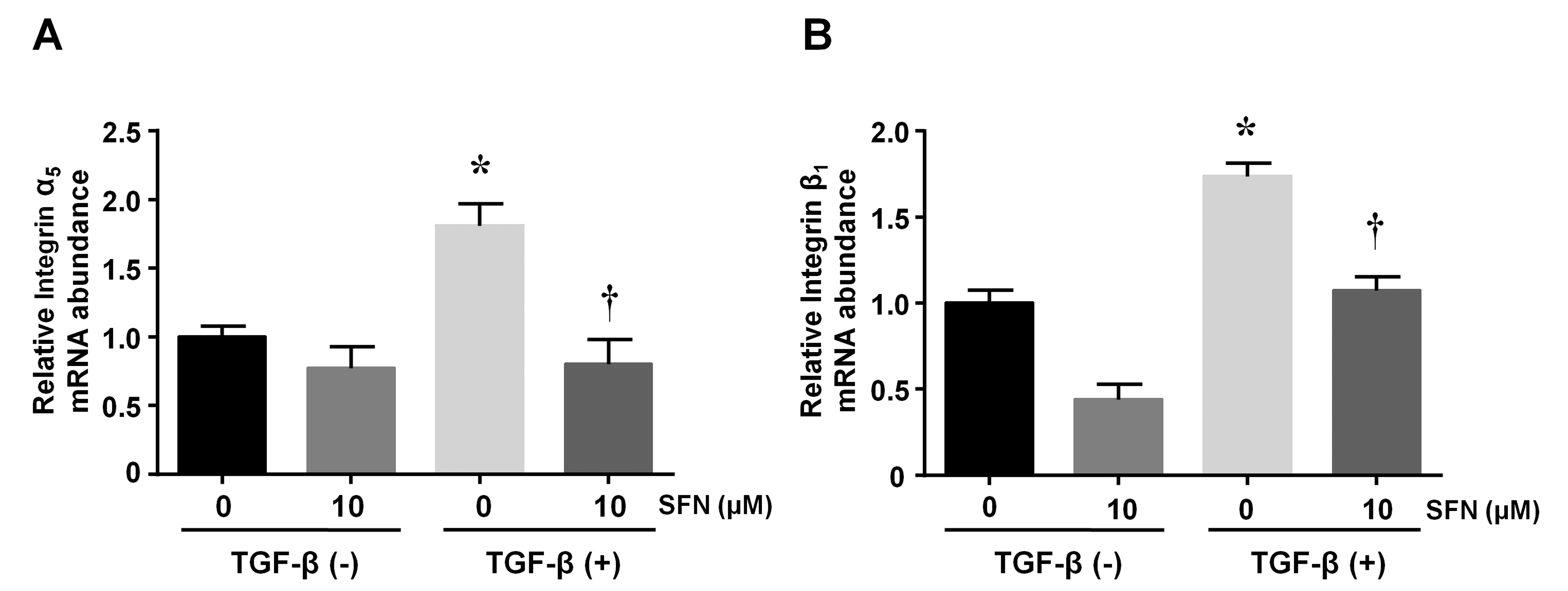 Figure 3. Effects of SFN on the expression of integrins in HTFs. Representative bar graphs showing the relative expression of integrins