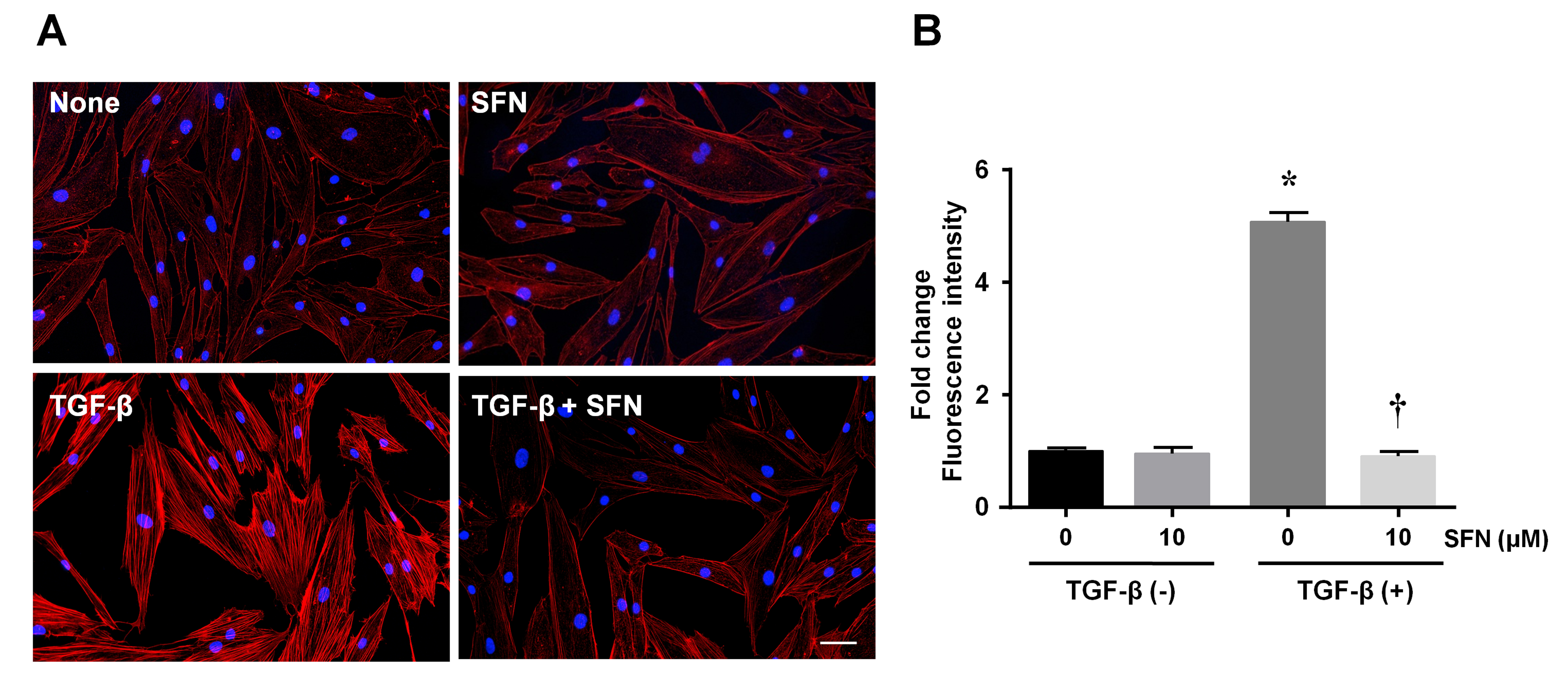 bars: 50 µm. Fluorescence intensity analysis in (A) is shown in (B). Data are presented as mean ± SD (n=3). *p<0.05 compared to controls. †p<0.05 compared to cells treated with TGF-β alone.