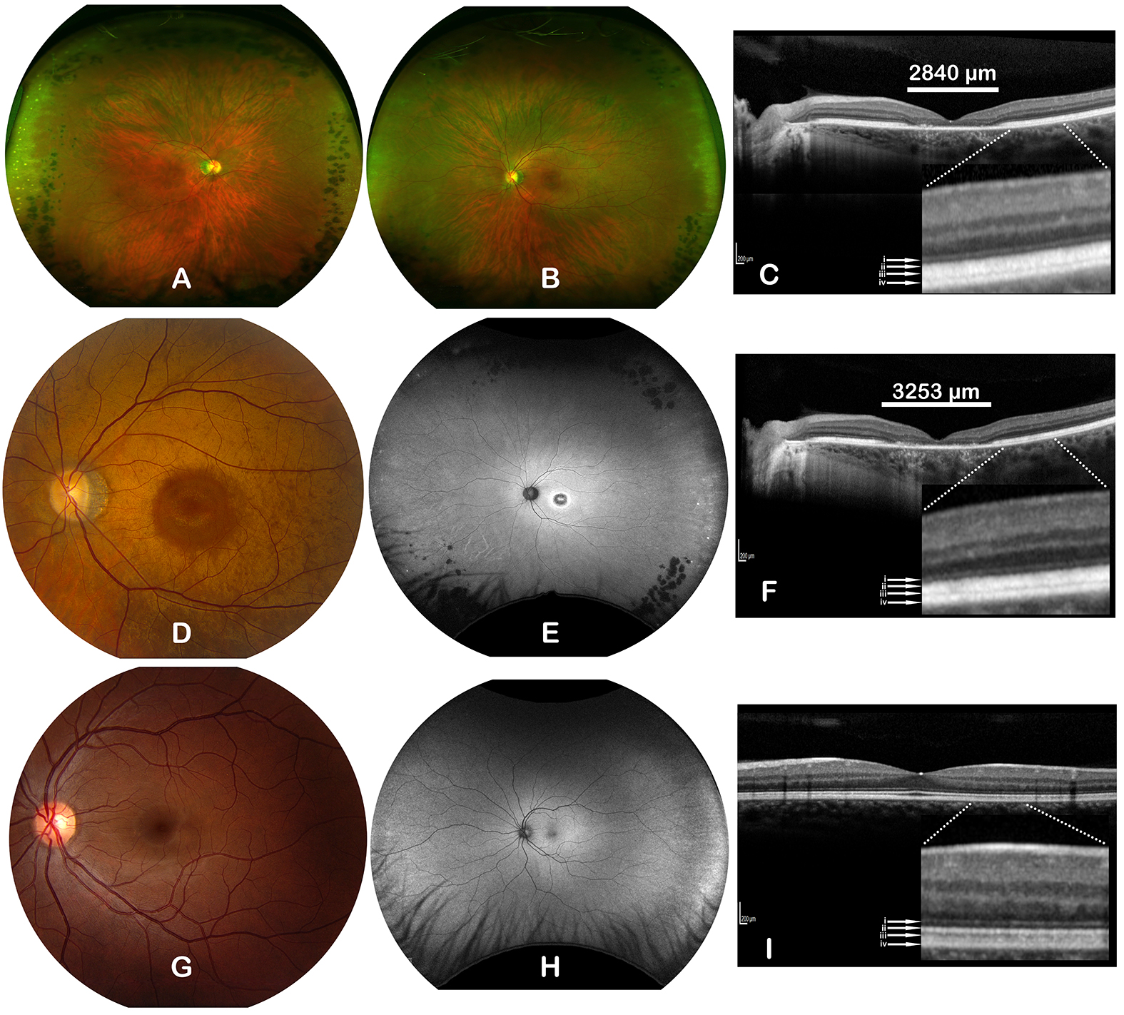 Figure 1. Retinal imaging for subject P1 (A–F) compared to a normal subject (G–I). (A, B) Wide-field retinal photography for P1 taken