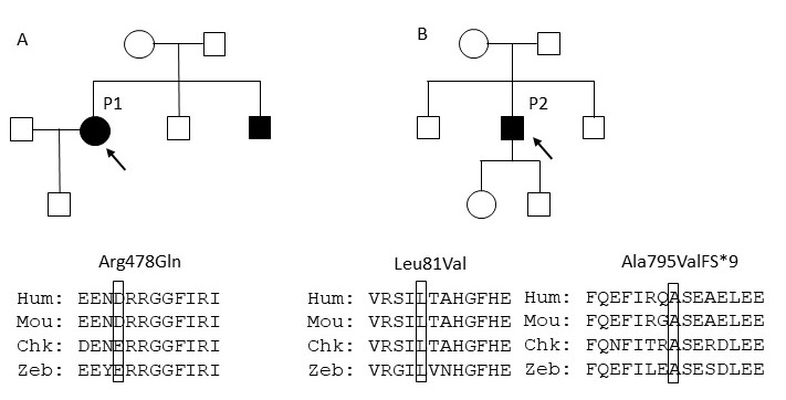 Figure 3. Evolutionary conservation of variant nucleotides identified by genetic testing. (A) Family tree for subject P1. The homozygous mutation affecting codon Arg478 is conserved in mouse (Mou), chicken (Chk), and