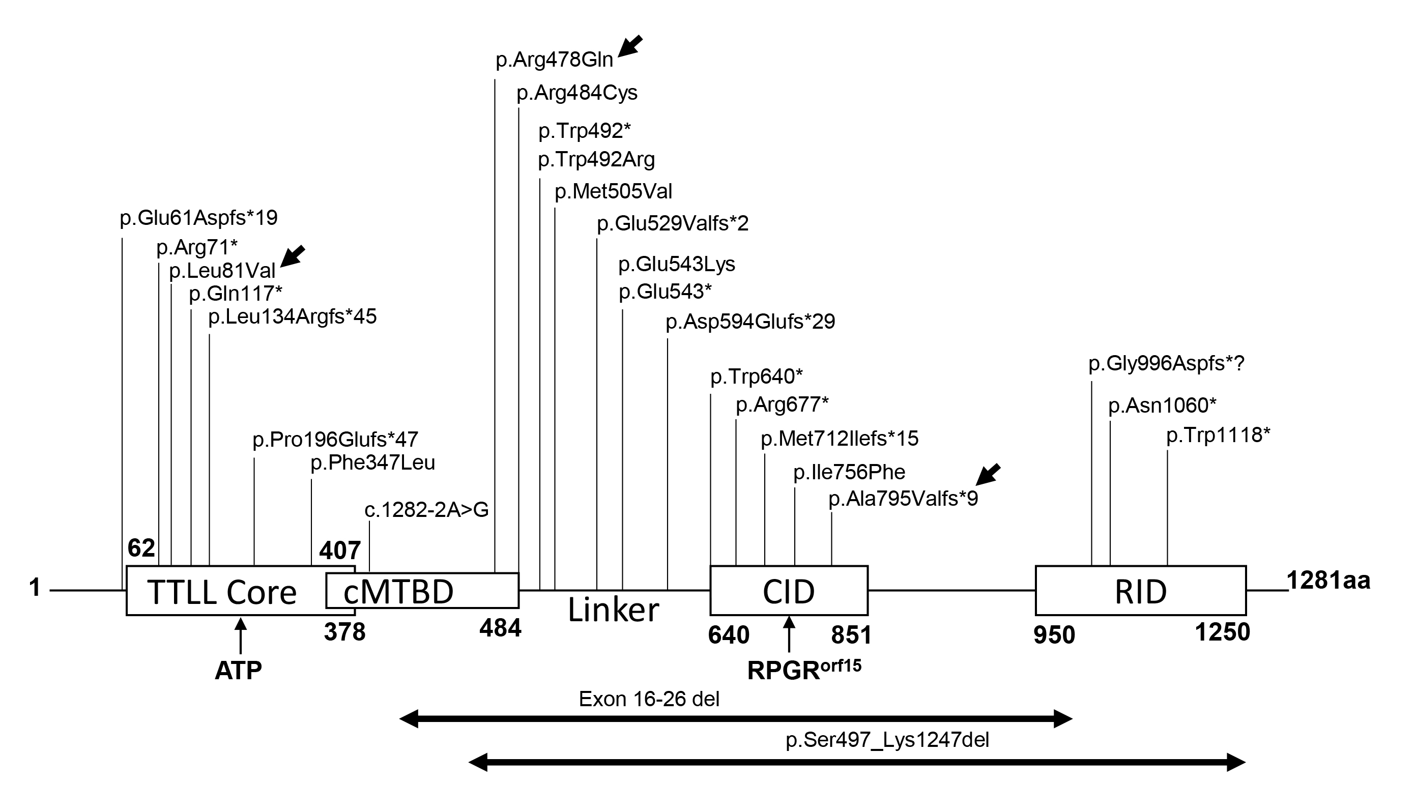 microtubulins; a linker region, followed by a cofactor interaction domain (CID) that interacts with to RPGRorf15; and a receptor interaction domain (RID) of unknown function. Bold-type numbers identify the amino acid (aa) position relative