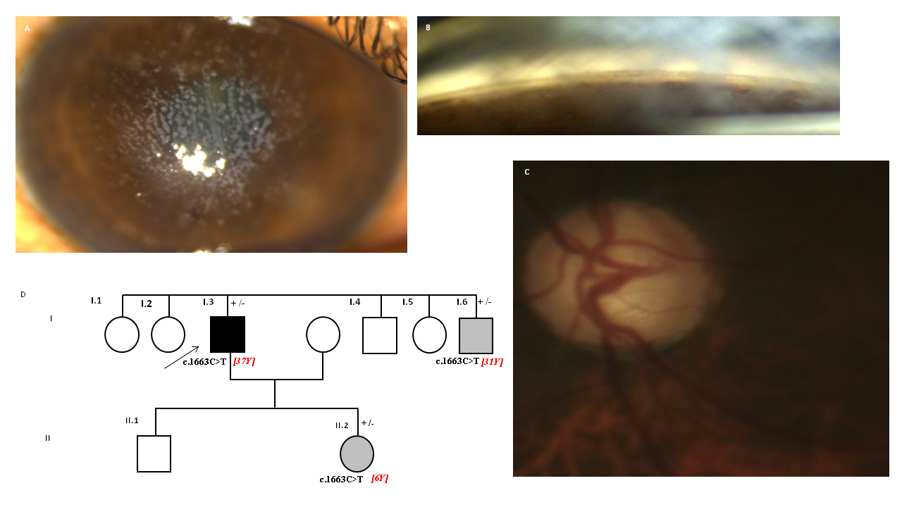Figure 3. Clinical photographs of patients with JOAG and corneal dystrophy. A: Anterior segment photo of the patient showing granular corneal dystrophy. B: Goniophotograph showing open angles. C: Fundus photograph of the patient showing advanced glaucomatous optic atrophy. D: Pedigree chart of the patient. Black shaded square depicts the proband having glaucoma and granular dystrophy. Grey shaded