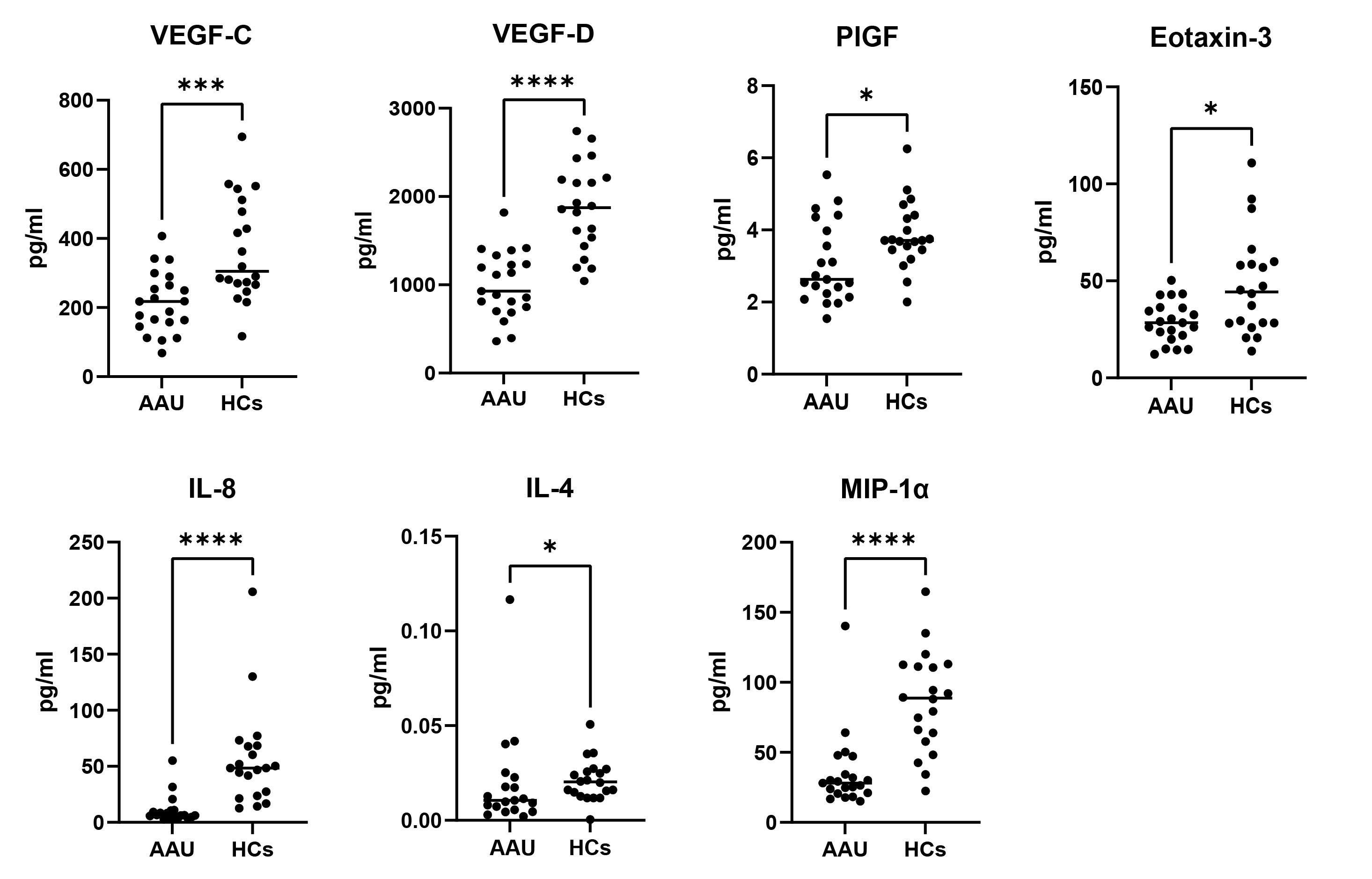 Figure 2. Cytokine/chemokine expressed at lower levels in serum from patients with HLA-B27+ AS-associated AAU compared to HCs. Mann–Whitney U test and Student’s t test were performed to check for statistical significance between groups when required (****p < 0.001, **p < 0.01, *p < 0.05).