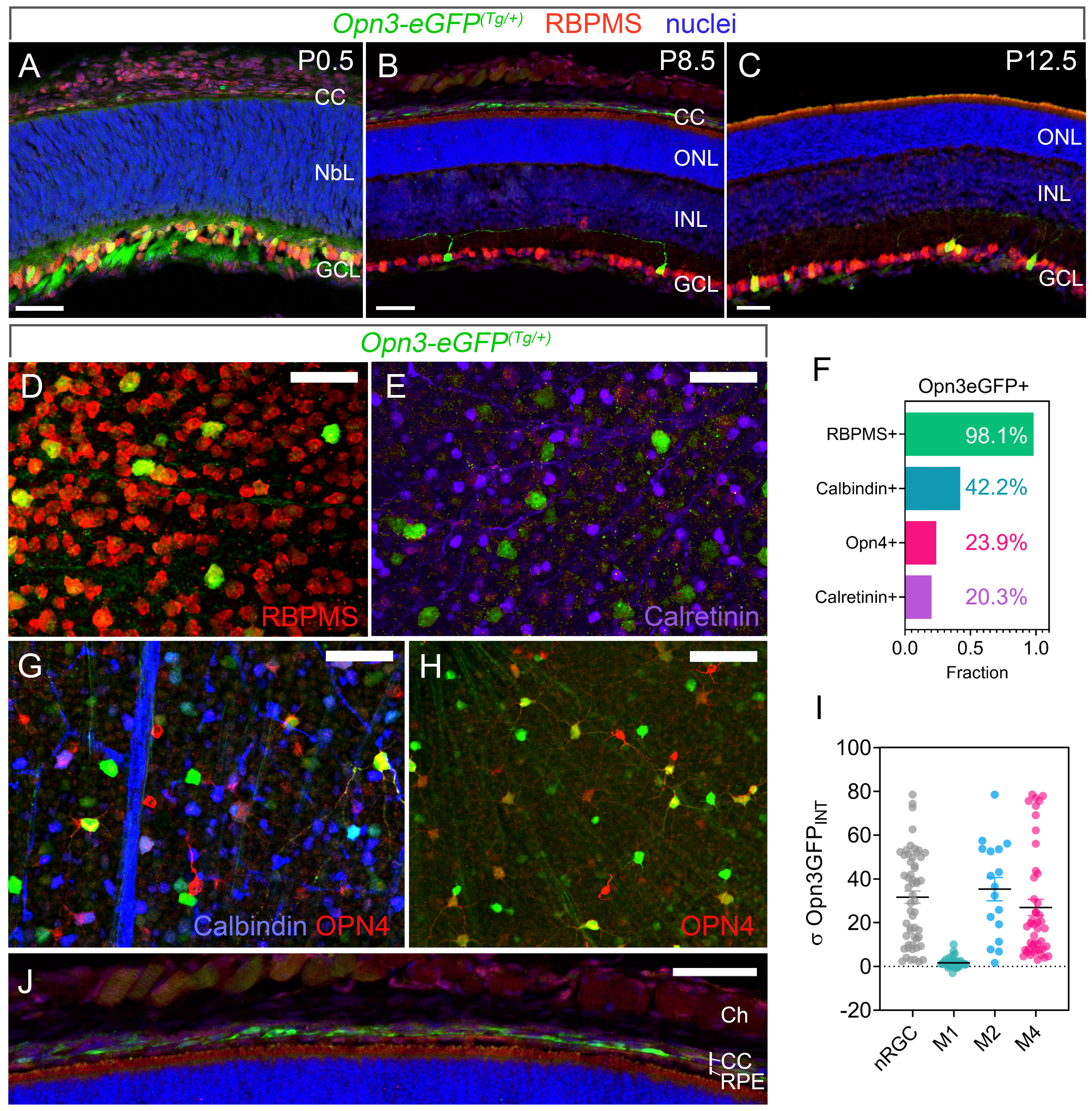 (GCL). Nuclei are DAPI labeled (blue). The proportion of ganglion cells that express Opn3-eGFP is high at P0.5 (A) and reduced by P8.5 (B). Opn3-eGFP is also expressed in cells of the choriocapillaris (CC; A, B). D, E: Whole-mount retina from Opn3-eGFP(Tg/+) mice at P16 labeled for GFP (green) and melanopsin (red; D) or GFP (green) calbindin (blue) and calretinin (magenta; 25 µM scale bars). F: Chart showing the proportion of Opn3-eGFP(Tg/+) cells that are positive for RBPMS (D), calretinin (E), calbindin (G, scale bar 25 µM), and OPN4 (H, scale bar 50 µM). I: Along with the morphological assessment of dendritic arbors, this analysis identified populations of Opn3-eGFP RGCs that did not express OPN4 (nRGC: gray), the M1 subtype of OPN4 RGC, which did not express Opn3-eGFP (M1-ipRGC: green), and two subtypes of OPN4 RGC, the M2 (M2-ipRGC: blue) and M4 (M4-ipRGC: red), which expressed both OPN4