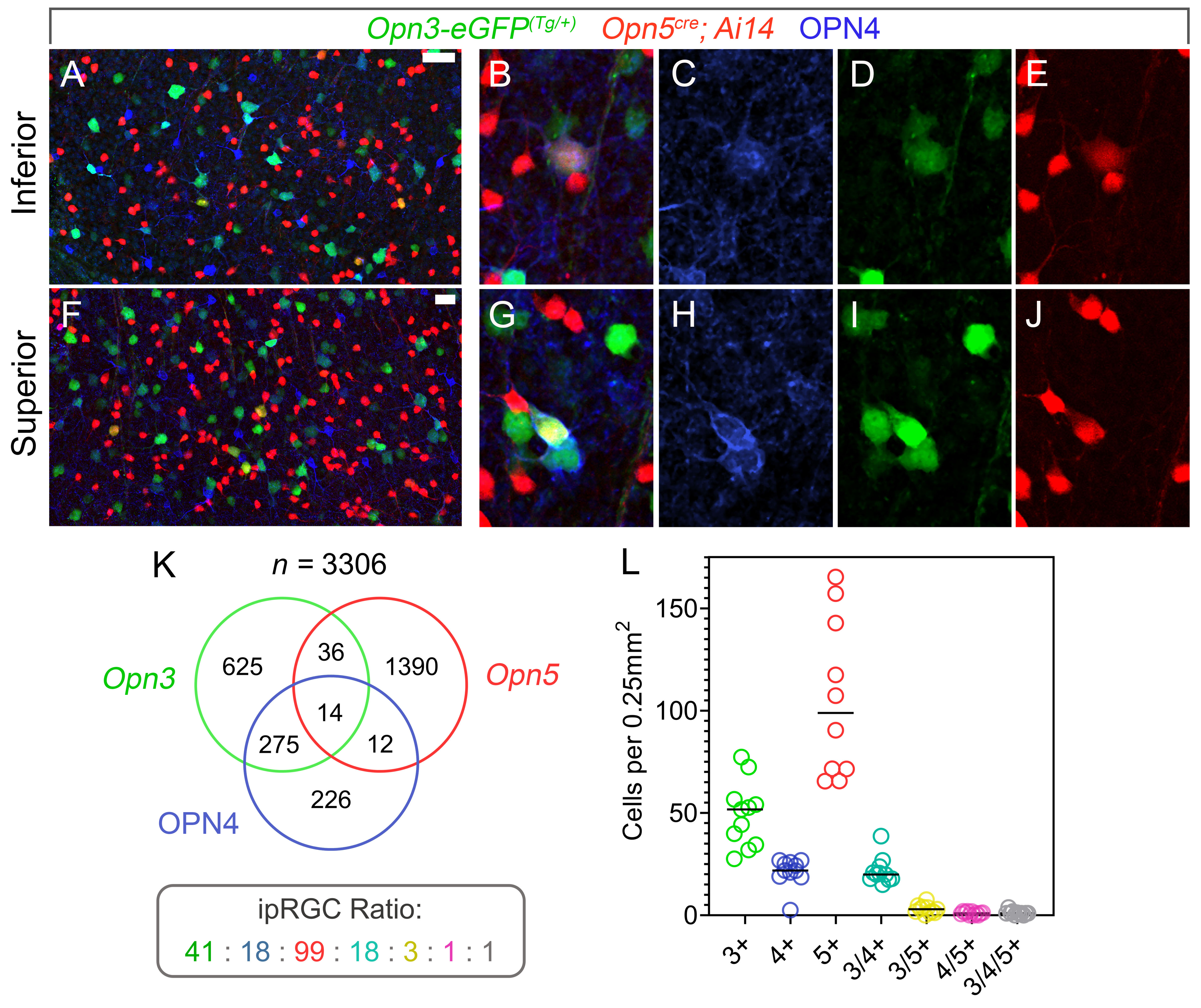 Figure 2. Opn3/OPN4 RGCs constitute the largest proportion of multi-opsin RGCs (A–J). Whole-mount retinae from P28 Opn3-eGFP; Opn5cre; Ai14 mice imaged for GFP (green), OPN4 (blue), and tdTomato (red). Both low (A, F, 50 µM scale bars) and high (B, G) magnifications are shown as are the channel separations (C–E and H–J). K: Venn diagram showing the amount of RGCs, out of 3306 assessed, that express, single, double, or triple combinations of Opn3, OPN4, and Opn5. These data are also represented in the chart (L) showing the opsin expression combinations as a proportion of a single class of opsin-expressing RGCs.