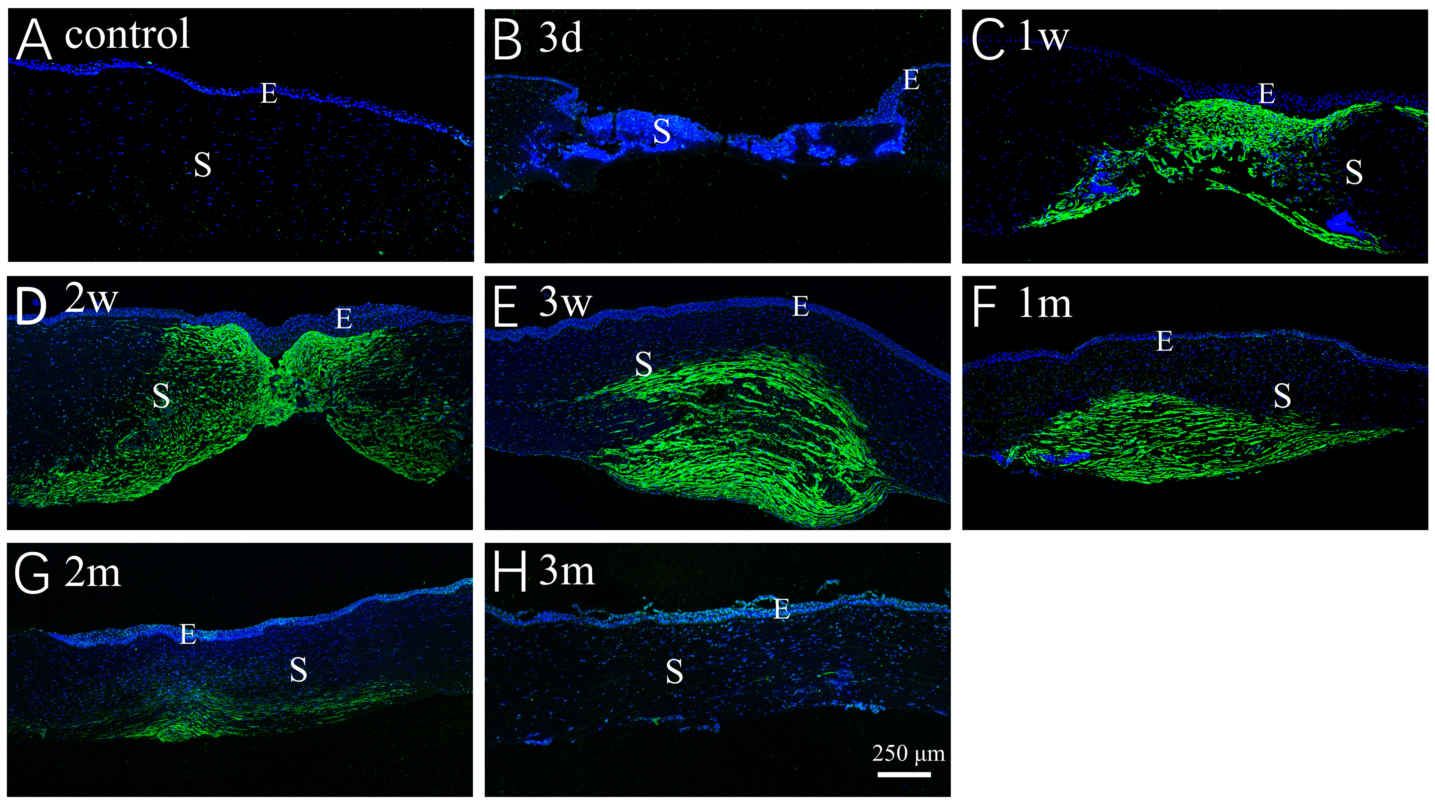 reduced. H: At 3 months after injury, α-SMA staining was nearly absent in the wound stroma. Green staining indicates α-SMA protein.