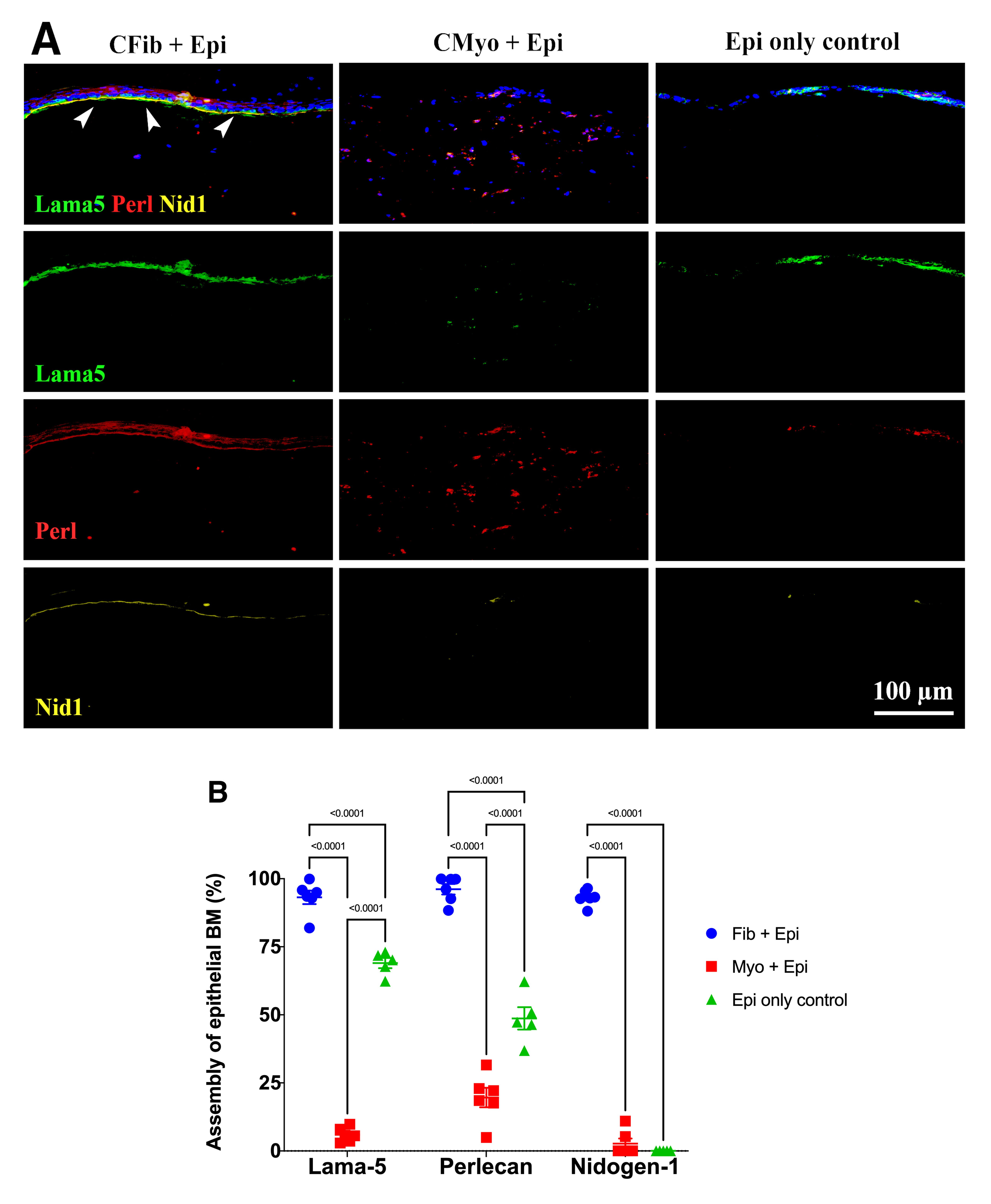 (red), and nidogen-1 (yellow) at the interface between the epithelial cells and the fibroblasts, suggesting a well-assembled