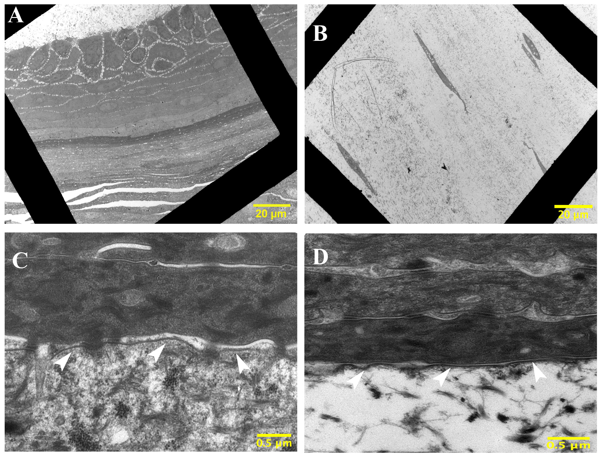 Figure 7. Transmission electron microscopy (TEM) showing epithelial BM assembly. A: The presence of a well-orchestrated, multi-layered stratified epithelium when cultured in the presence of fibroblasts in
