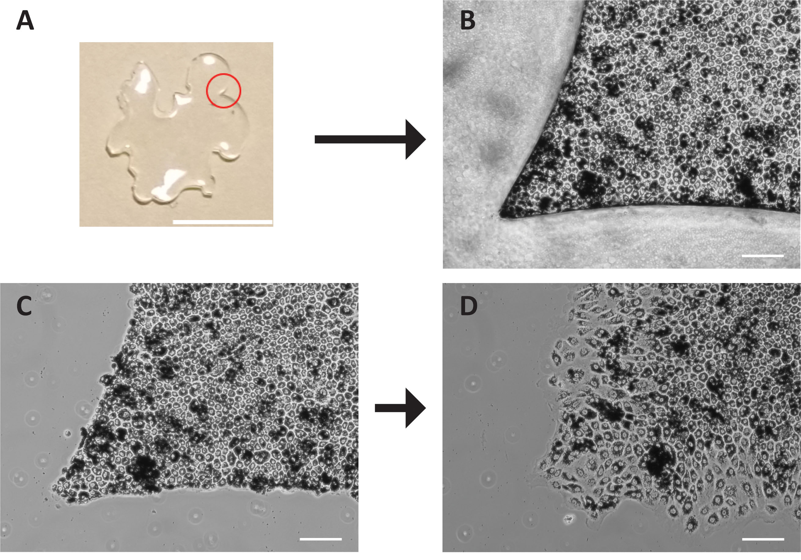 was removed, the monolayer maintained the shape of the stencil. D: One day after stencil removal, the cells grew into the