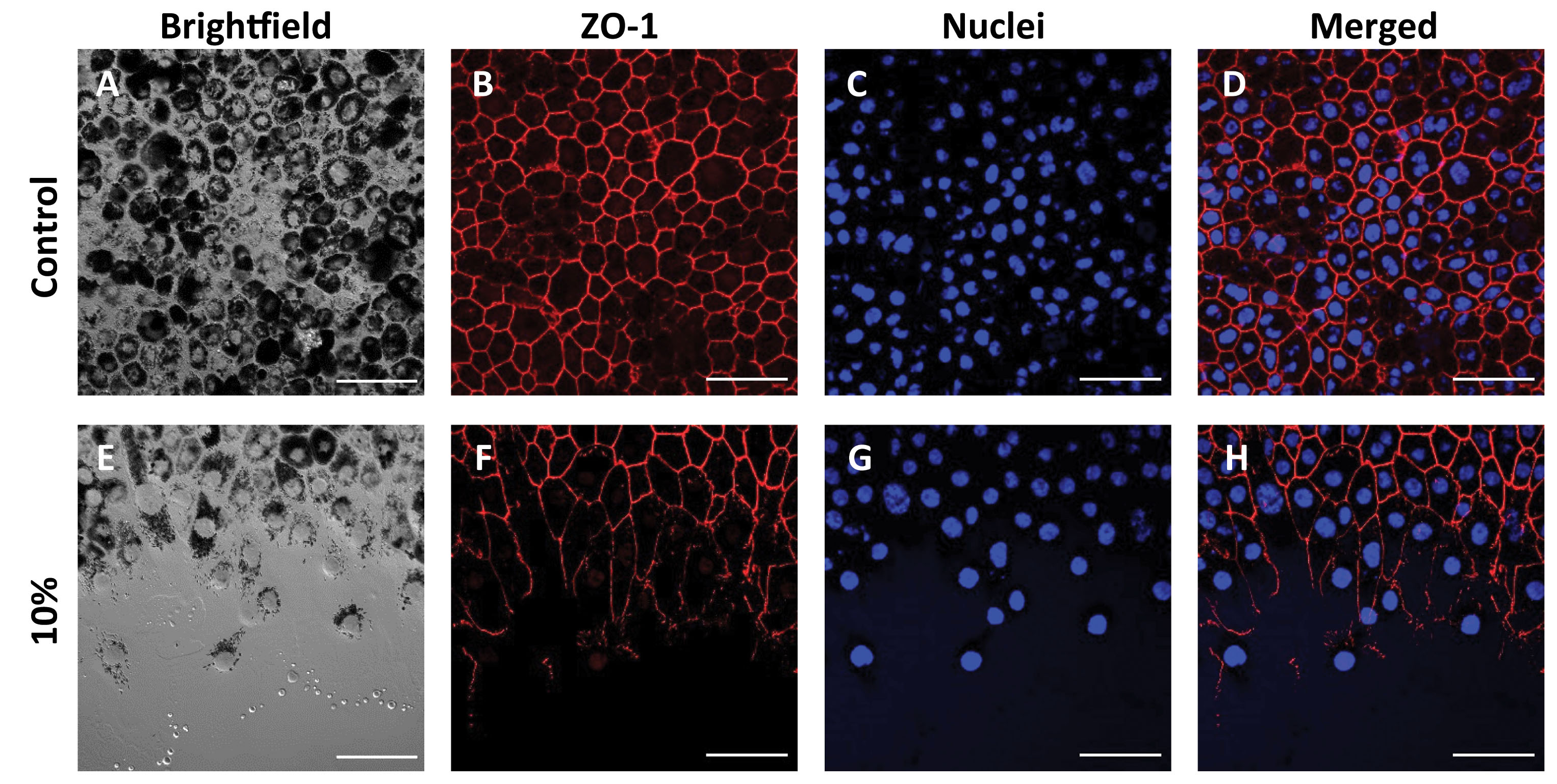 to a 10% stencil had fragmented ZO-1 localization. Scale bars: 50 µm.