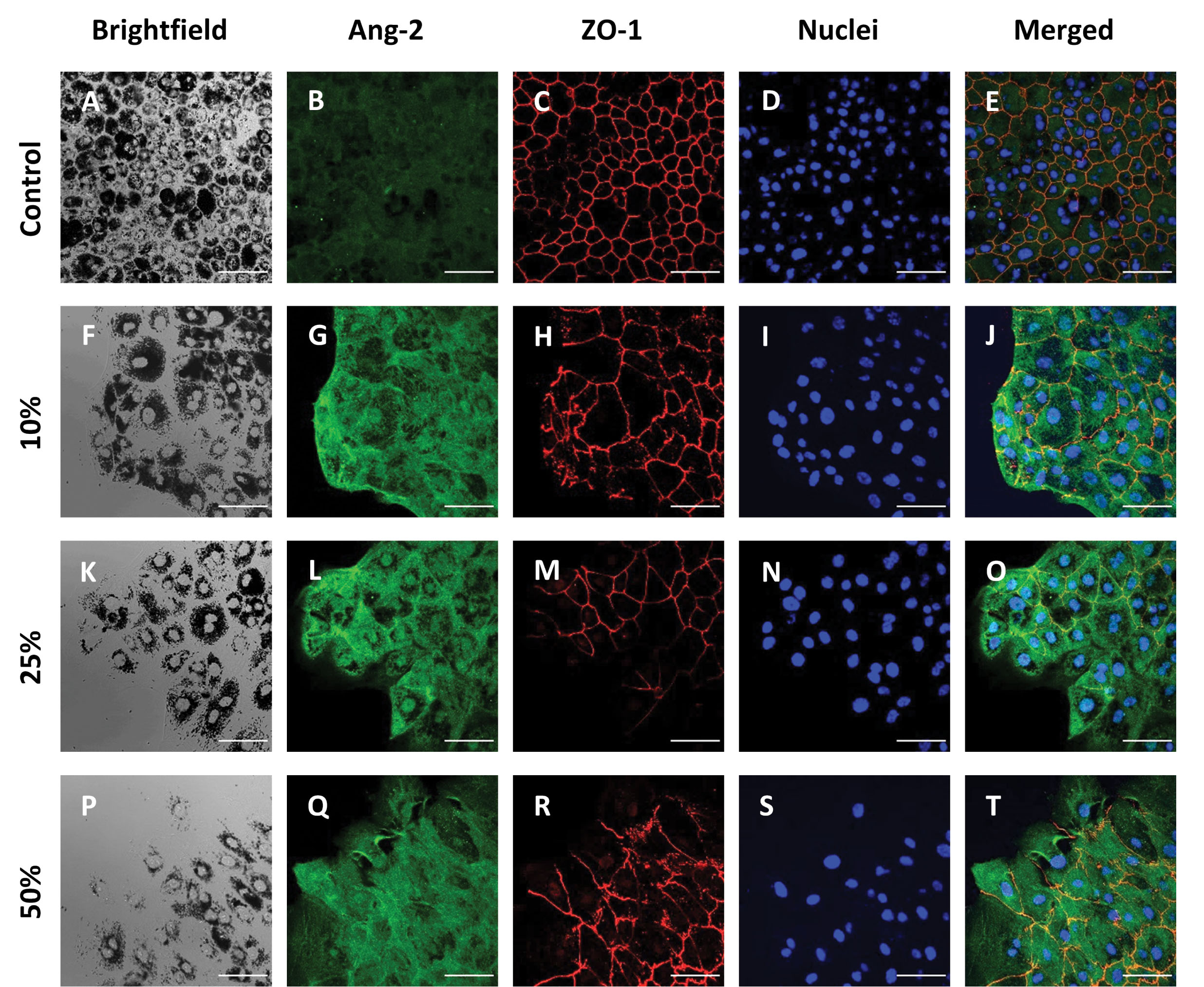 normal conditions exhibited less Ang-2 expression and more intercellular ZO-1 localization. F–T: Cells that responded to stencil