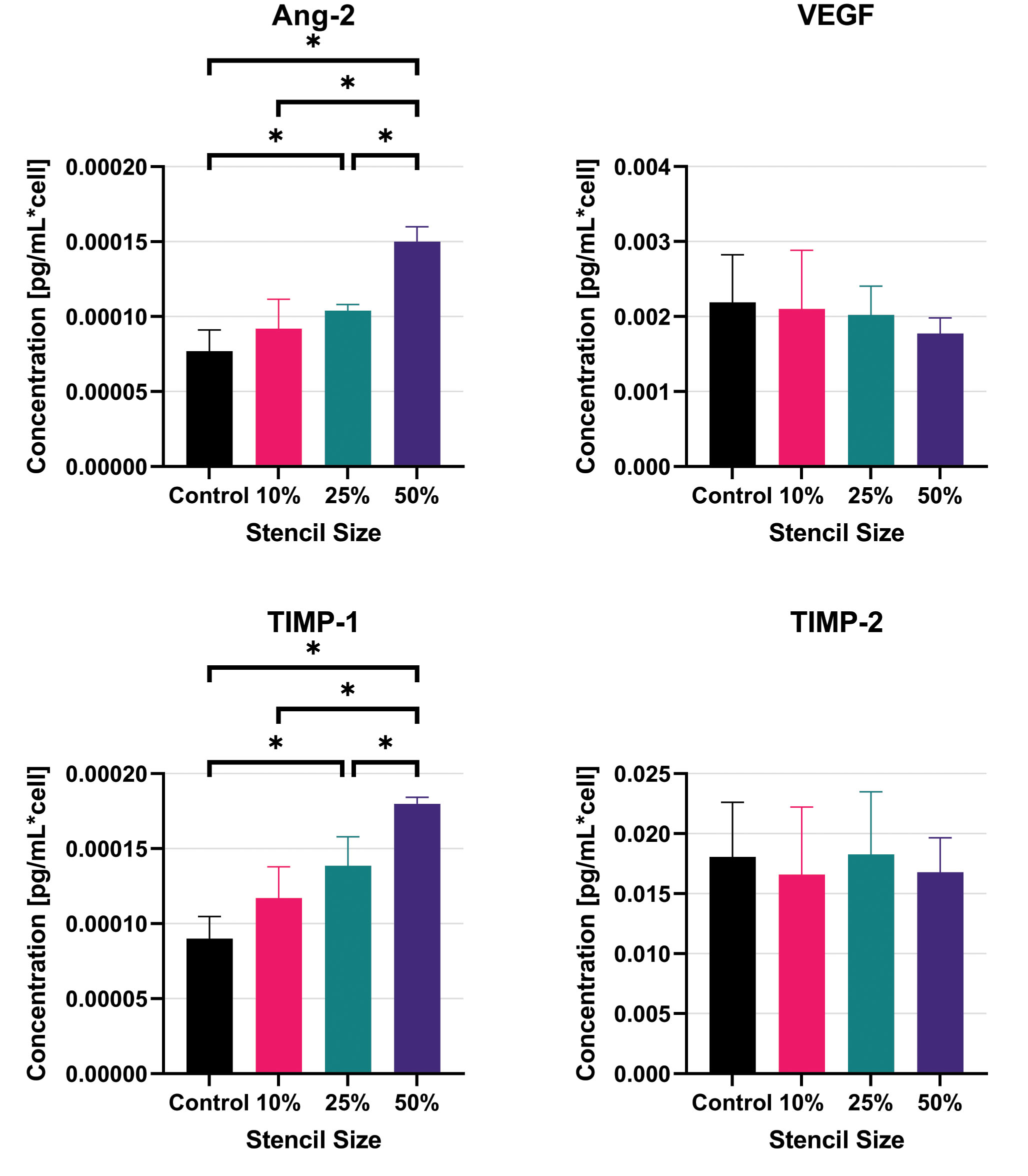 Mean concentrations of Ang-2, VEGF, TIMP-1, and TIMP-2 proteins in cell media 1 day after stencil removal. Error bars represent standard deviations. *
