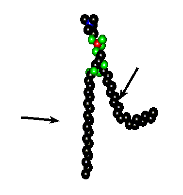 A model of phosphatidylcholine showing one saturated (left arrow) and one monounsaturated (right arrow) fatty acid ester. The polar head group is at the top and contains a phosphorus atom. A color legend is shown below.