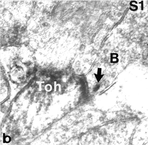 b) Bipolar (B) ribbon input (arrow) to a Toh-IR profile in S1 of the IPL.