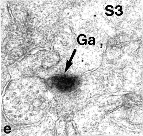 e) A GABA+ amacrine (Ga), containing colloidal gold particles, is presynaptic to a small Toh-IR profile in S3.