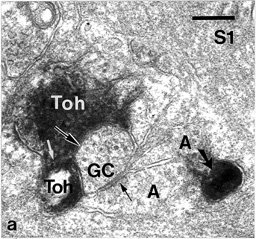 | a) Toh-IR processes are presynaptic to other Toh-IR processes (white arrow) and to a ganglion cell (GC) dendrite (black/white arrow) in S1. The GC dendrite is also postsynaptic to an unstained amacrine cell (A). A neighboring unstained amacrine cell (A) is presynaptic to another Toh-IR process.