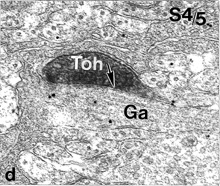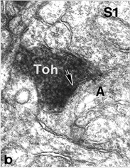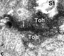 c) A large Toh-IR process makes a synapse upon another smaller Toh-IR profile in S1.