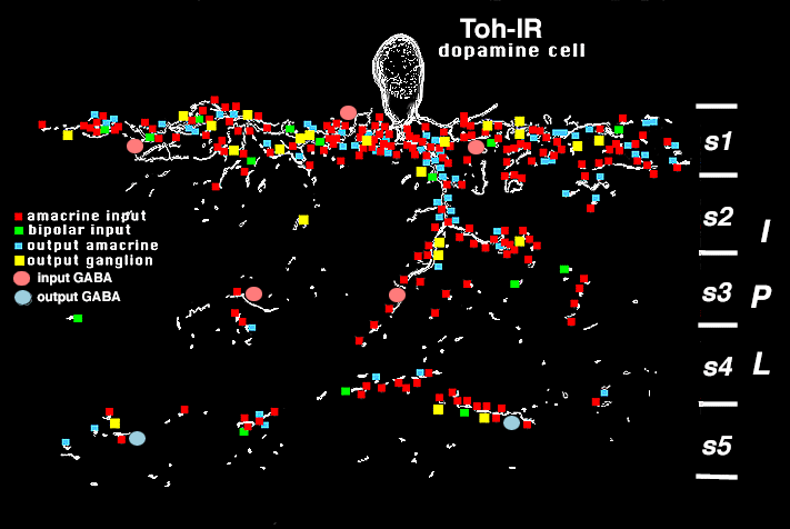 Other Toh-IR dendrites in the tissue were studied but did not necessarily get traced to the Toh-IR cell body. In the 15 um thick slab of tissue studied by EM, the Toh-IR cell and related processes received mostly amacrine synapses (red) in all strata of the IPL, and a few bipolar ribbon synapses (green) to the main tiers of dendrites in stratum 1, strata 2/3 and 4/5 borders. Toh-IR stained profiles were presynaptic to amacrine and ganglion cell processes (blue, yellow). Postsynaptic ganglion cell dendrites costratified in the three main dendritic tiers of the Toh-IR cell.