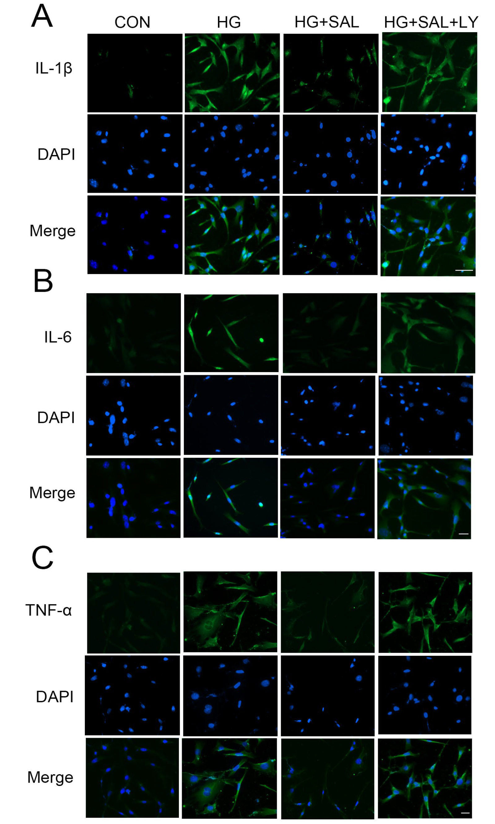 The protein expression of IL-1β, IL-6, and TNF-α was determined by immunofluorescence analysis. The results were consistent