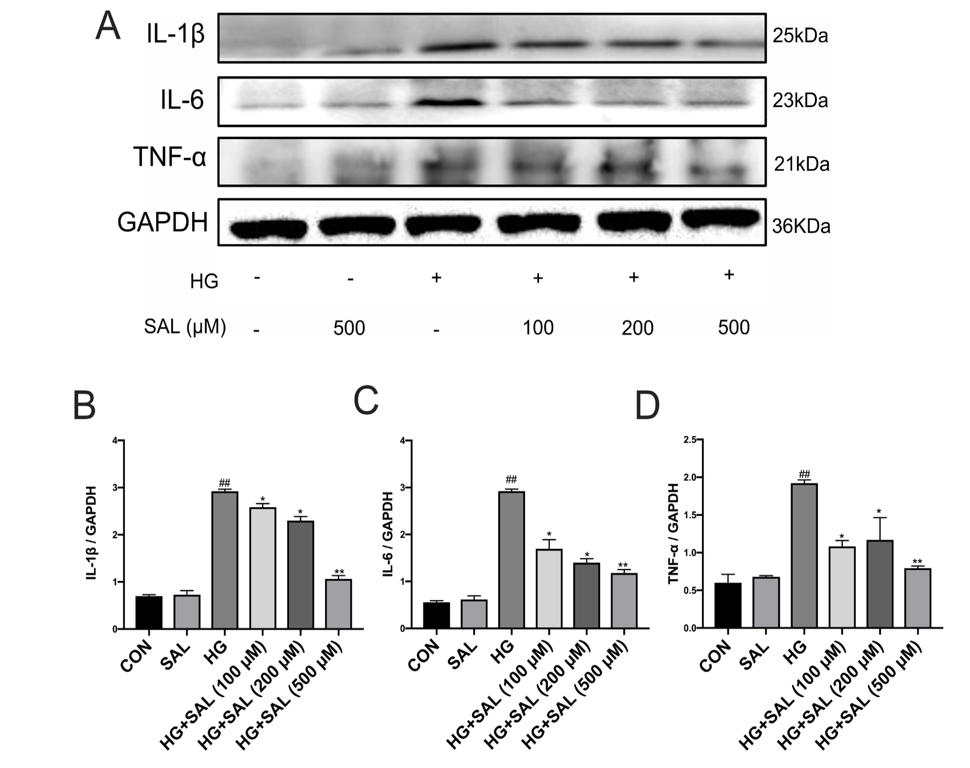 of SAL (100, 200, 500 µM) for 6 h and then stimulated with HG (50 mM) for 48 h. A: The levels of IL-1β, IL-6, and TNF-α were determined by western blotting. B–D: Quantitative analyses of the protein expression of IL-1β, IL-6, and TNF-α.