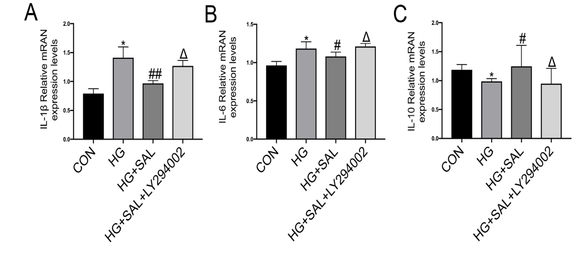 Figure 9. SAL influenced the mRNA expression of inflammatory factors in rMC-1 cells. The mRNA expression of IL-1β, IL-6, and IL-10 was
