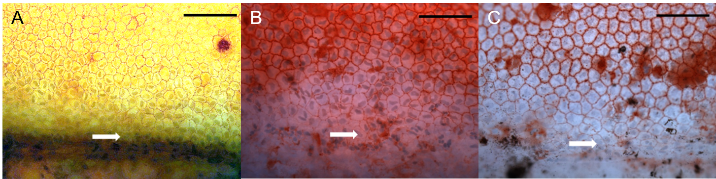 Figure 1. En face view of the corneal endothelial transition zone (white arrow) between the corneal endothelium and trabecular meshwork