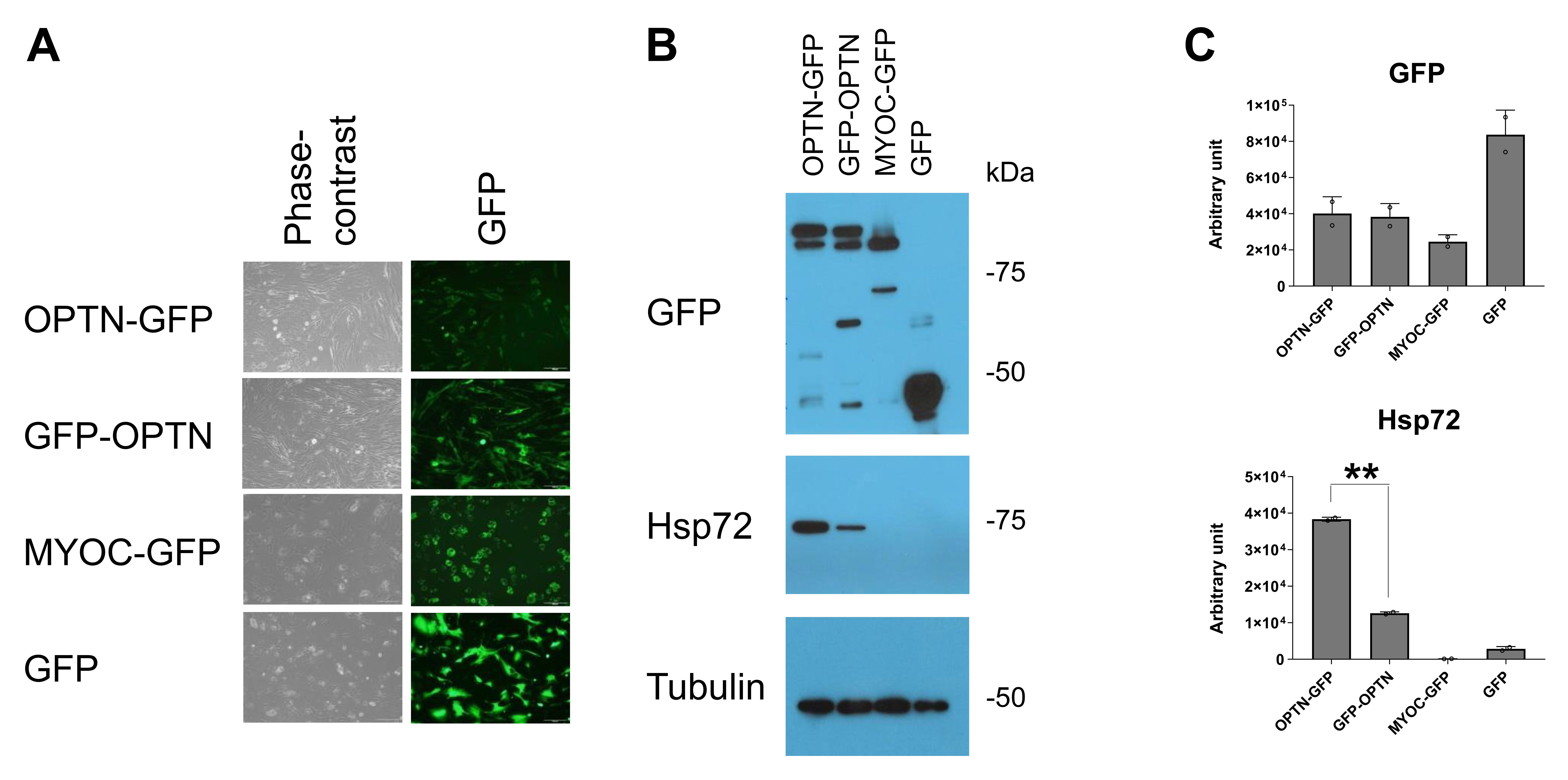 Figure 2. Induction of Hsp72 expression by GFP-OPTN in HTM cells. A: Images for phase-contrast and green fluorescence were separately photographed from cells transduced with adenoviruses expressing