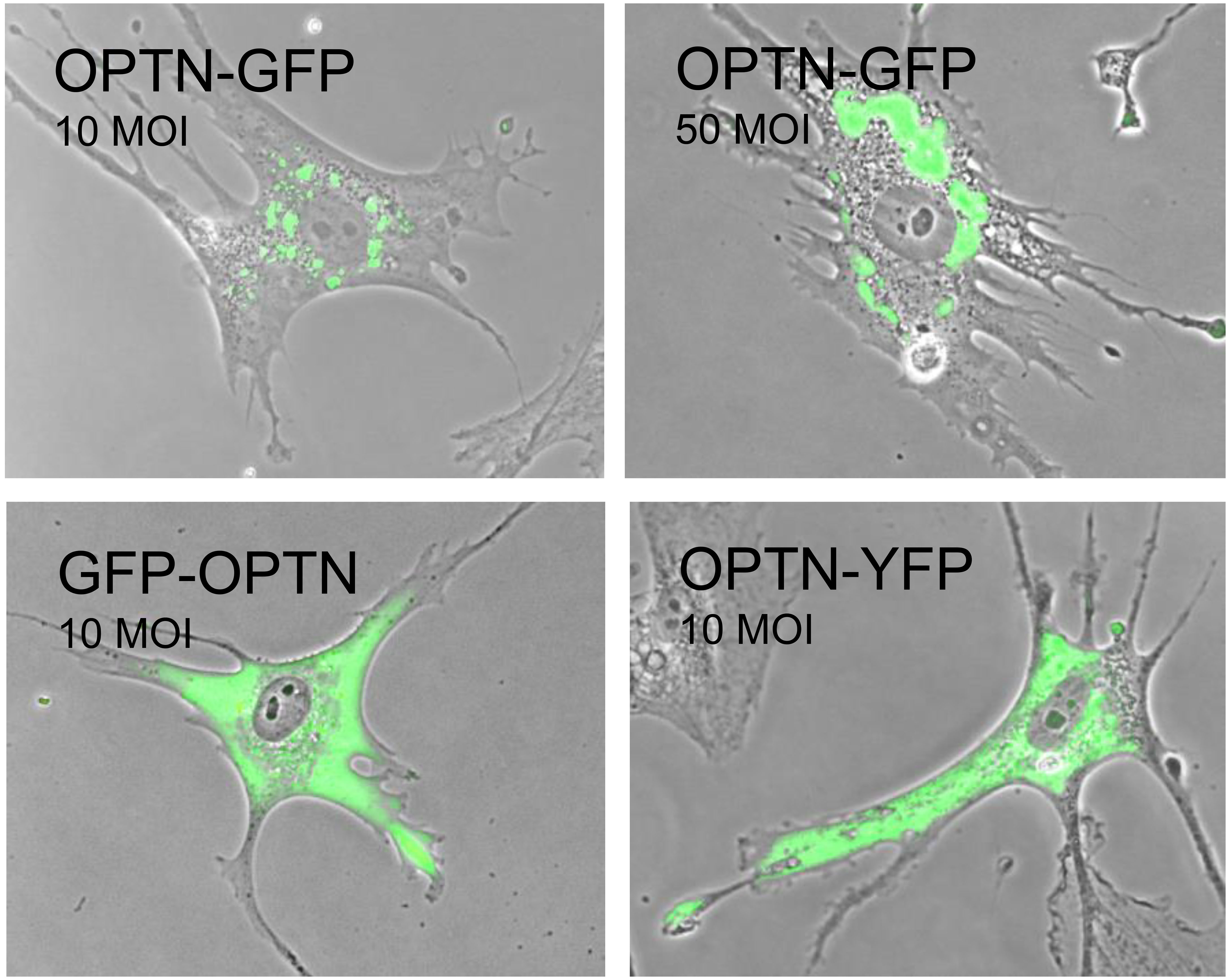 Figure 4. Typical images of OPTN-GFP against the contour of HTM cells. Merged images for phase-contrast and green fluorescence were