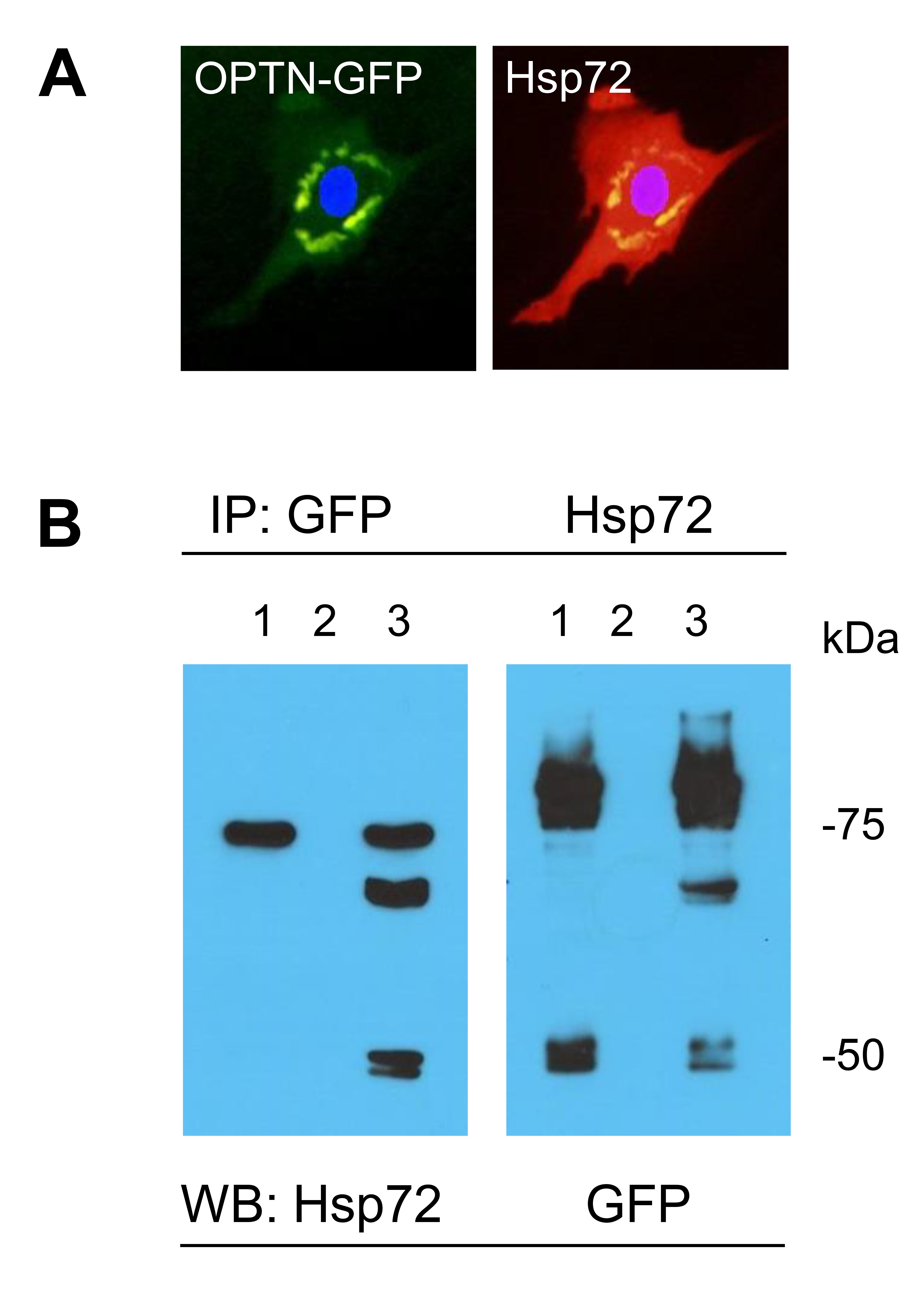 Figure 5. Colocalization and coimmunoprecipitation of OPTN-GFP with Hsp72 in HTM cells. A: Cells transduced with an adenovirus expressing optineurin-GFP were counterstained with DAPI, and Hsp72 (red) was visualized
