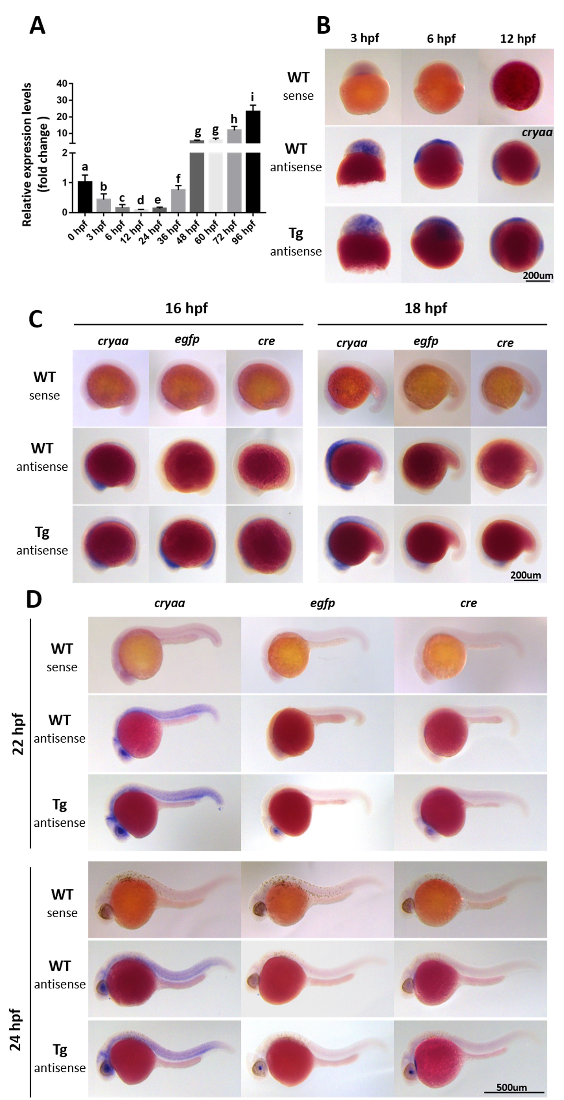 differences. n = 3. B: Whole-mount in situ hybridization (WISH) of cryaa mRNA at 3 hpf, 6 hpf, and 12 hpf stages in WT and zTg(cryaa:Cre-cryaa:EGFP; Tg) zebrafish. C, D: WISH of cryaa, egfp, and cre mRNA expression at 16 hpf, 18 hpf, 22 hpf, and 24 hpf in WT and zTg(cryaa:Cre-cryaa:EGFP; Tg) zebrafish.