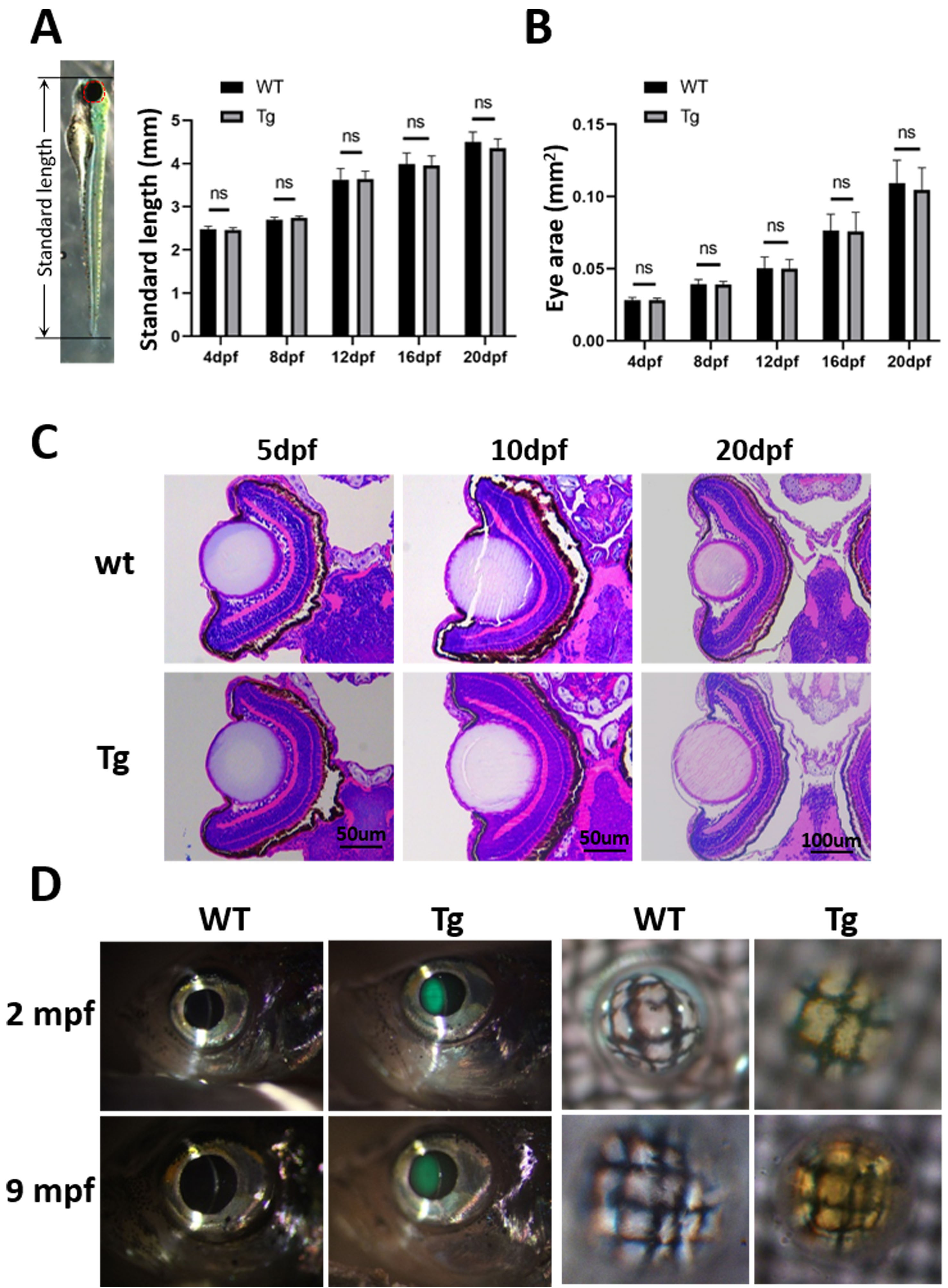 eye area calculation range is within the dotted red circle shown in A. Error bars indicate means ± SDs; ns indicates no significant differences; n = 20. C: H&E staining of paraffin-embedded eye sections of 5 dpf, 10 dpf, and 20 dpf WT and Tg-zebrafish. The standard length of